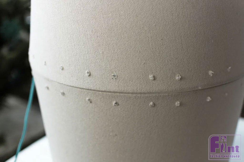 Начните размечать отверстия под будущую линию «сшивания». Размеры и места расположения отверстий можно определить по собственному усмотрению. Мы сделали отверстия на расстоянии 2 см от края абажура, а между отверстиями выбрали расстояние, равное приблизительно 4 см. Важно, чтобы ваши отверстия располагались на абажуре равномерно. Для этого измерьте диаметр широкой части абажура и поделите его на расстояние, через которое вы планируете делать отверстия. Так вы точно узнаете, сколько отверстий поместиться на вашем абажуре. Наша разметка была выбрана не случайно, поскольку мы решили сделать «строчку» сшивания двух абажуров в идее крестиков, верхняя часть которых находится на одном абажуре, а нижняя – на другом.