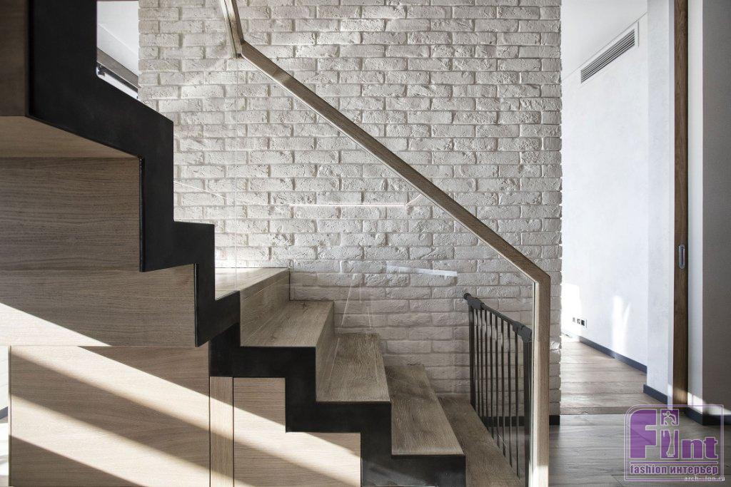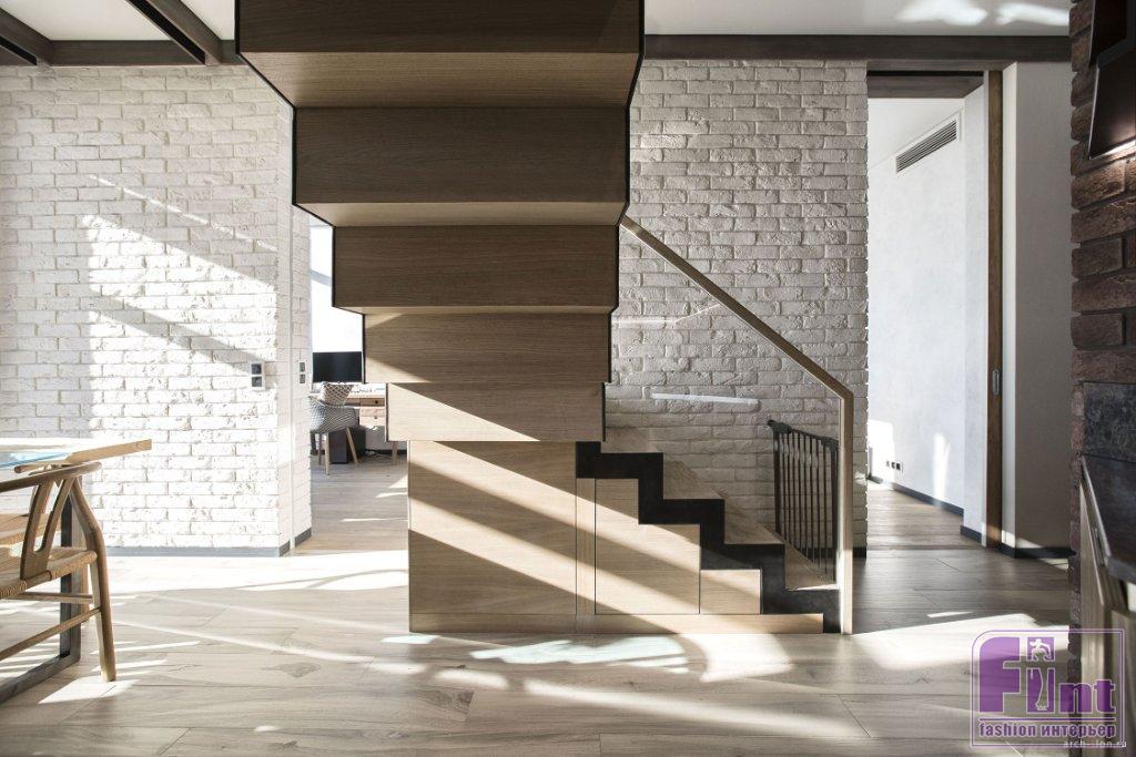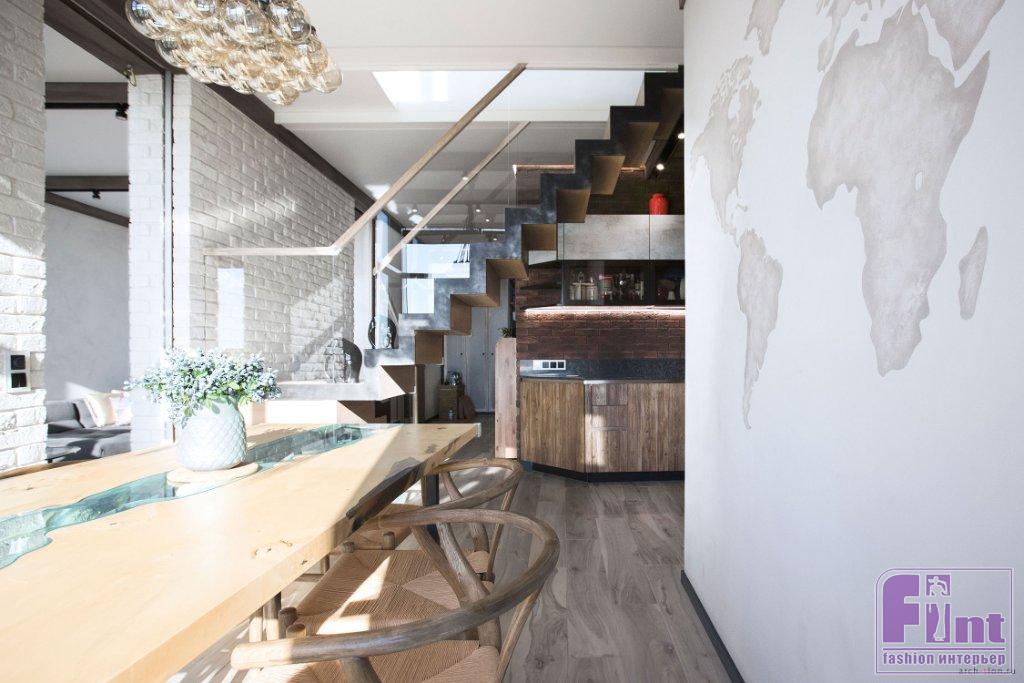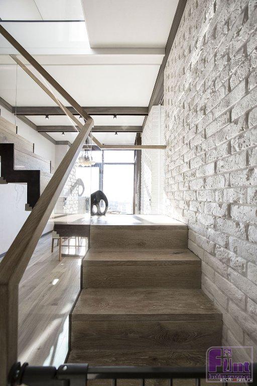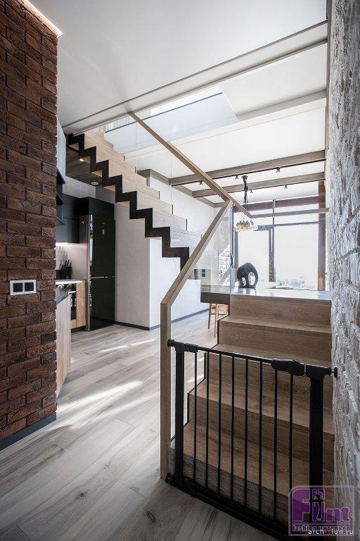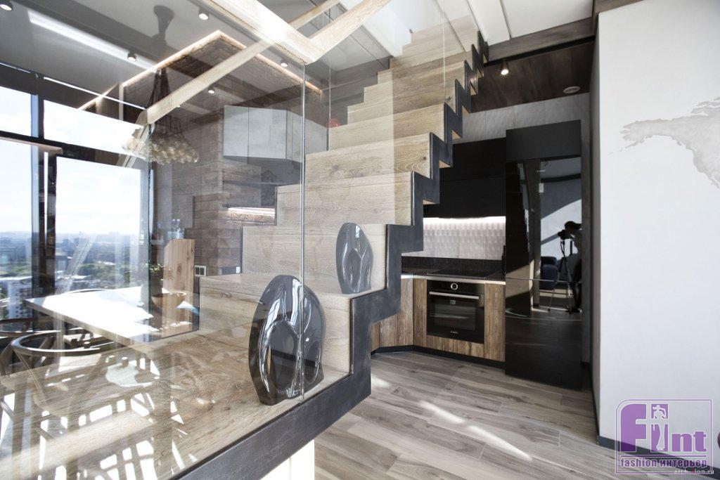Соединительным элементом между двумя этажами этой квартиры стала необычная лестница со стеклянным ограждением. Такая конструкция лестницы позволила добиться лёгкости, и органично вписать в интерьер этот довольно громоздкий и массивный элемент. Стеклянное ограждение венчают перила из натурального дерева, выполненные в стилистике лофта из искусственно состаренных деревянных брусков. Боковые поверхности ступеней отделаны металлом, что формирует дополнительную стилевую привязку к общему стилю квартиры.