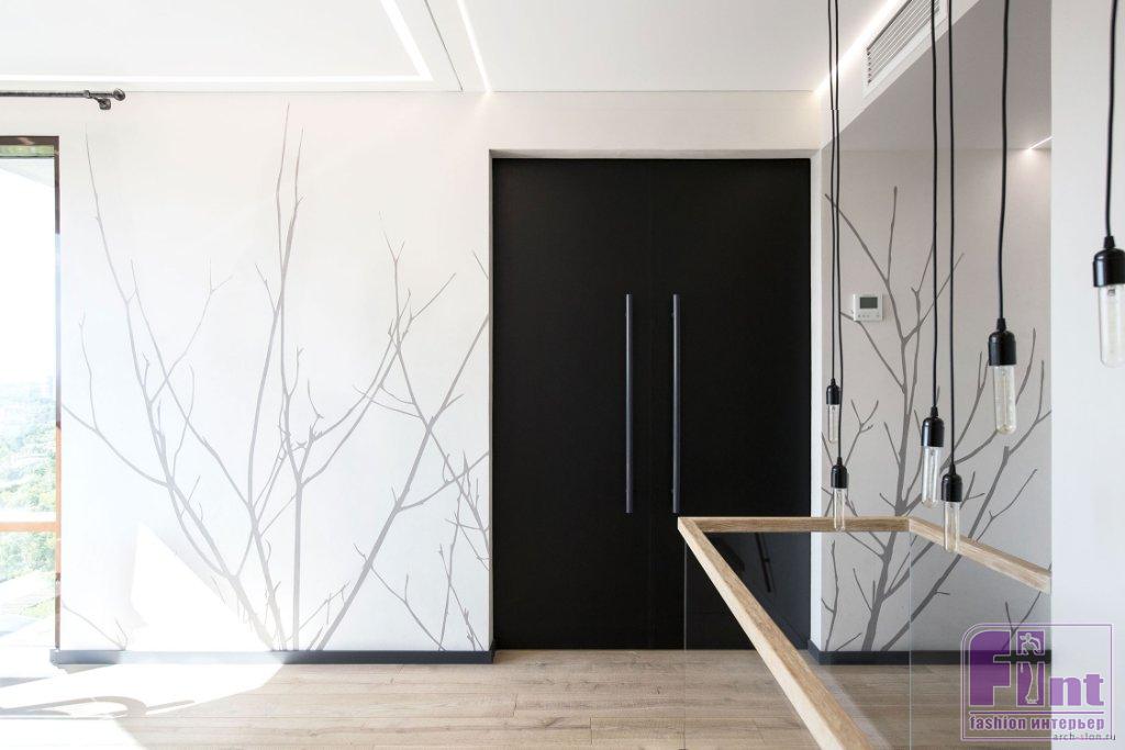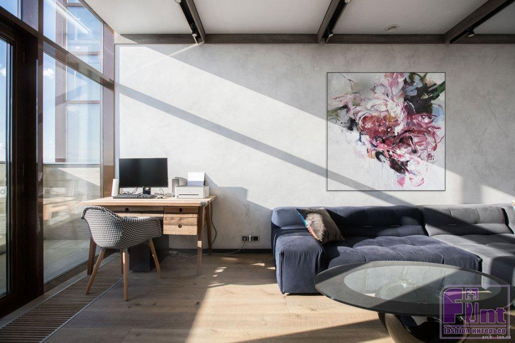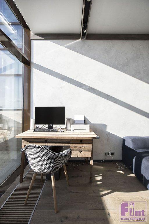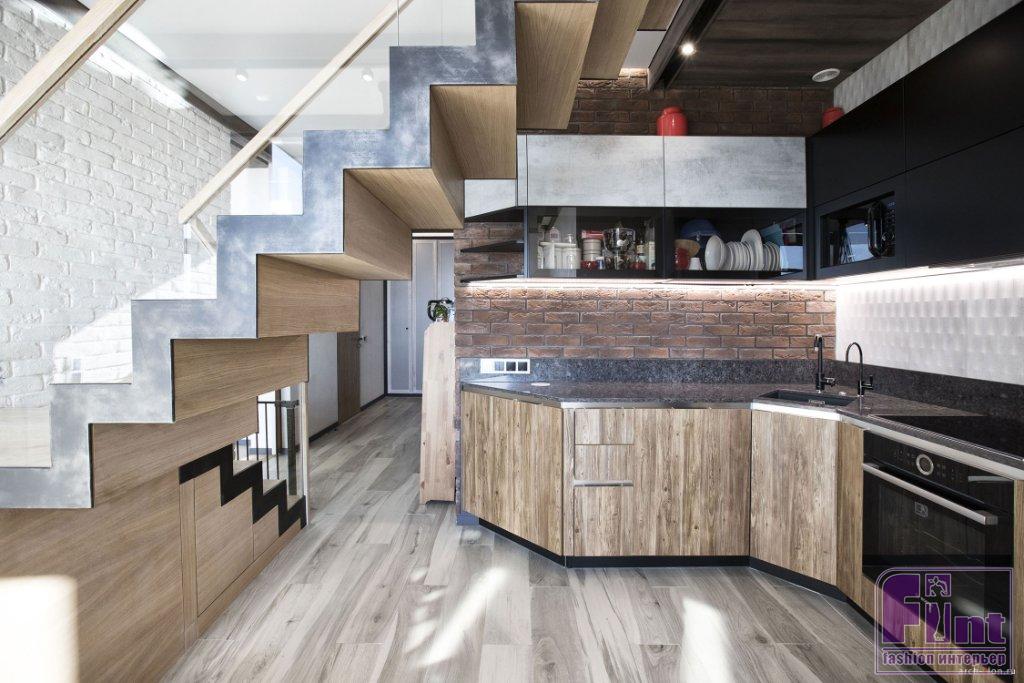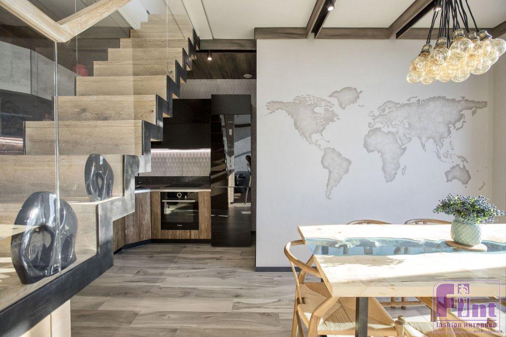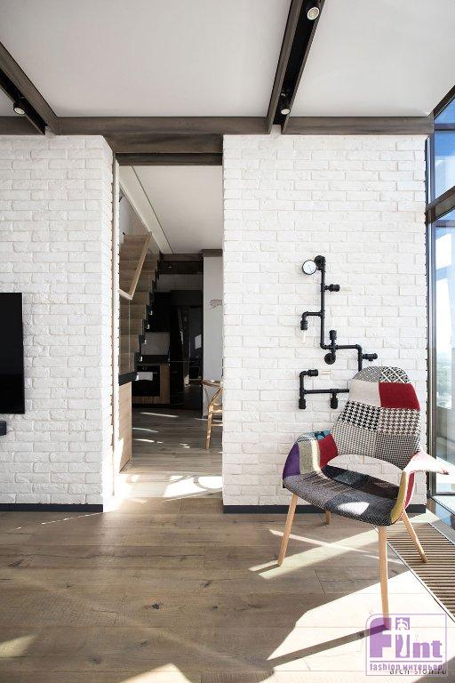 Соединительным элементом между двумя этажами этой квартиры стала необычная лестница со стеклянным ограждением. Такая конструкция лестницы позволила добиться лёгкости, и органично вписать в интерьер этот довольно громоздкий и массивный элемент. Стеклянное ограждение венчают перила из натурального дерева, выполненные в стилистике лофта из искусственно состаренных деревянных брусков. Боковые поверхности ступеней отделаны металлом, что формирует дополнительную стилевую привязку к общему стилю квартиры.