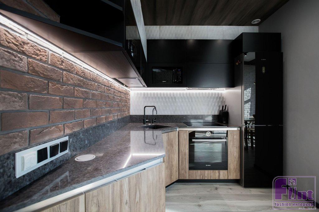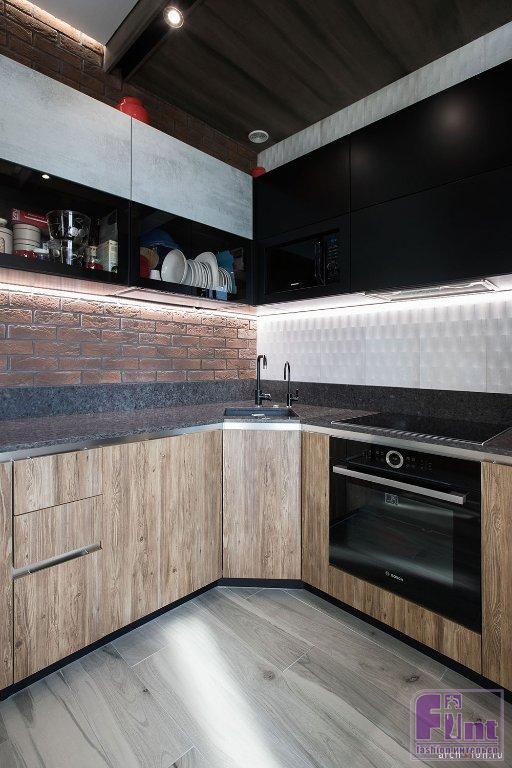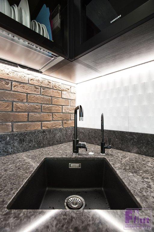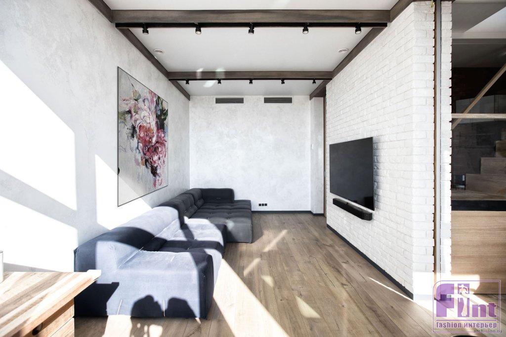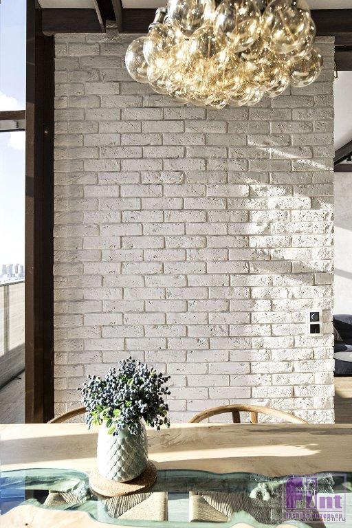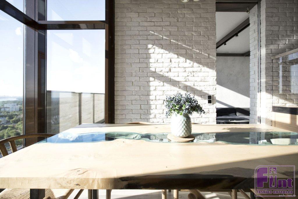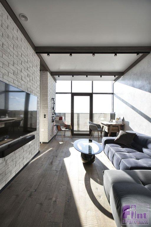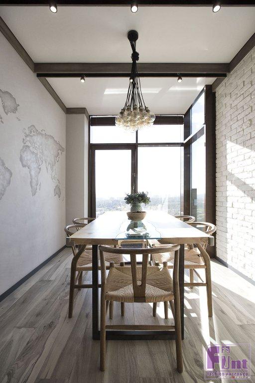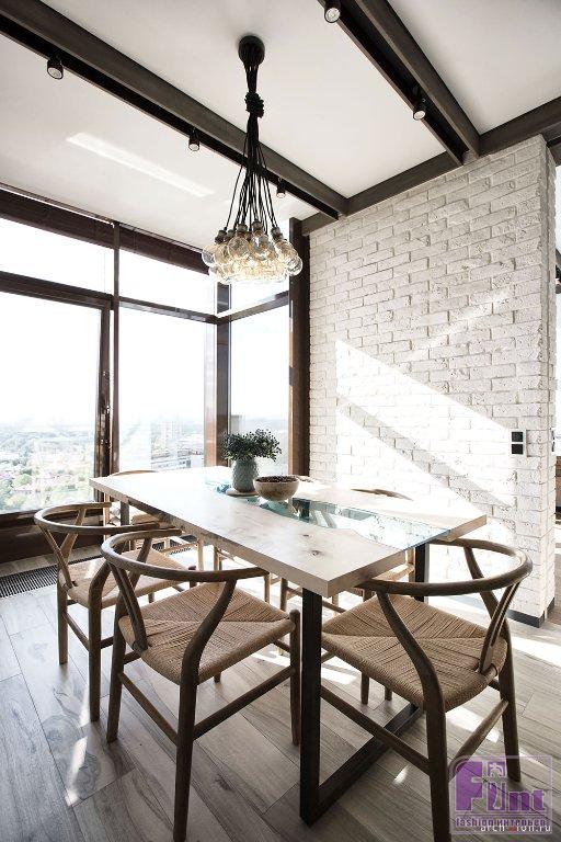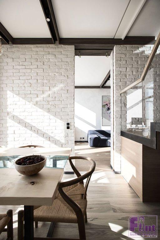 Отправной точкой при создании интерьера этой двухъярусной квартиры стали панорамные окна, из которых открывается живописный вид на Москву. Большое количество дневного света, проникающего в квартиру, позволило авторам проекта эффектно обыграть фактурность классических для стиля лофт материалов: кирпича, дерева, металла. Наличие второго уровня в квартире дало возможность дизайнерам Archslon разделить жилую и общественную зоны квартиры. На первом этаже в небольшом пространстве под лестницей расположена кухня, из смежной с ней столовой открывается прекрасный вид.