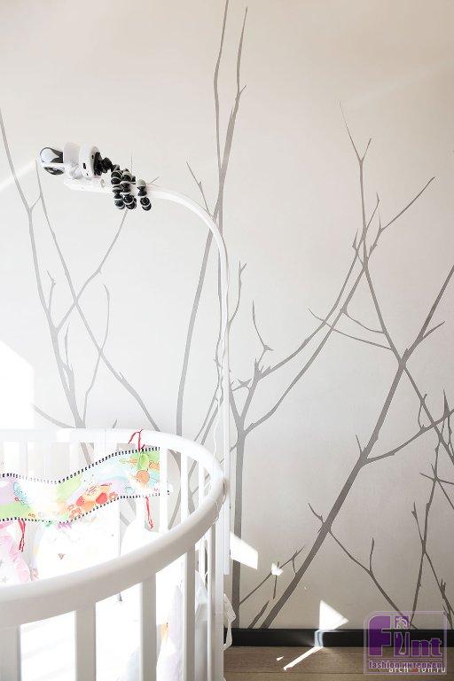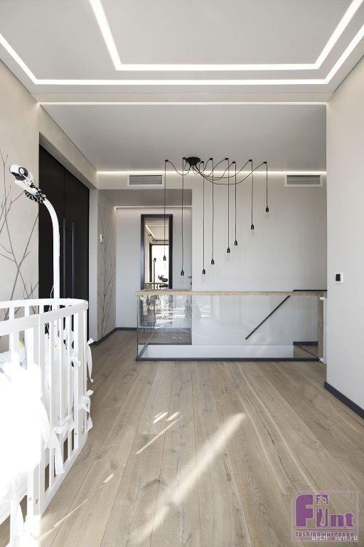 В целом же первый этаж получился гораздо брутальнее — чего стоит один светильник в гостиной из водопроводных труб. Второй ярус отведён под приватные помещения. Второй этаж, по замыслу дизайнеров, решён в более спокойной визуальной схеме: светлые стены становятся фоном для необычных светильников и мебели. Здесь преобладают спокойные светлые тона, выступающие идеальным фоном для необычных предметов мебели и декора. Именно в приватной зоне дизайнеры обустроили светлую детскую комнату, в которой установлена белая мебель.