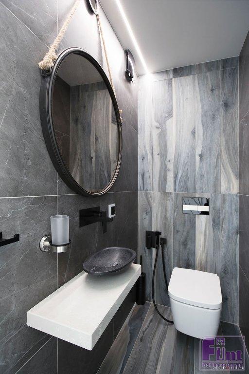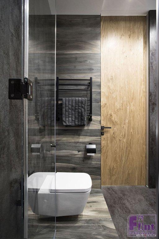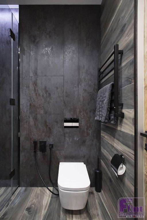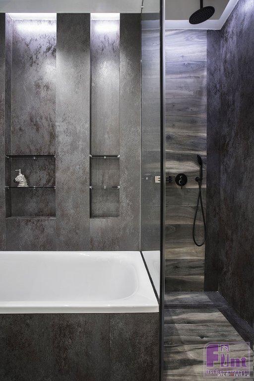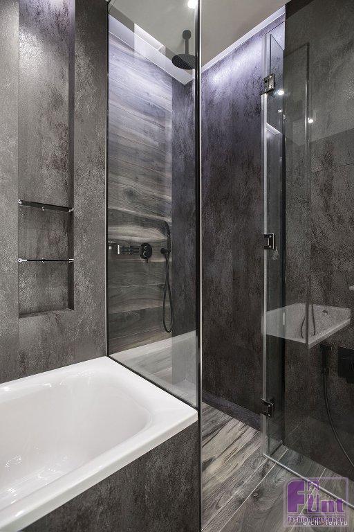 Ванные комнаты в квартире оформлены в монохромной цветовой гамме с преобладанием благородного серого оттенка. Основным отделочным материалом для ванных комнат послужил керамогранит с неброским узором камня. Массивность керамогранита компенсируют многочисленные аксессуары и предметы интерьера из стекла. Так, например, в оформленных из керамогранита нишах полки для хранения выполнены из специального закалённого стекла, что делает пространство более просторным и лёгким.