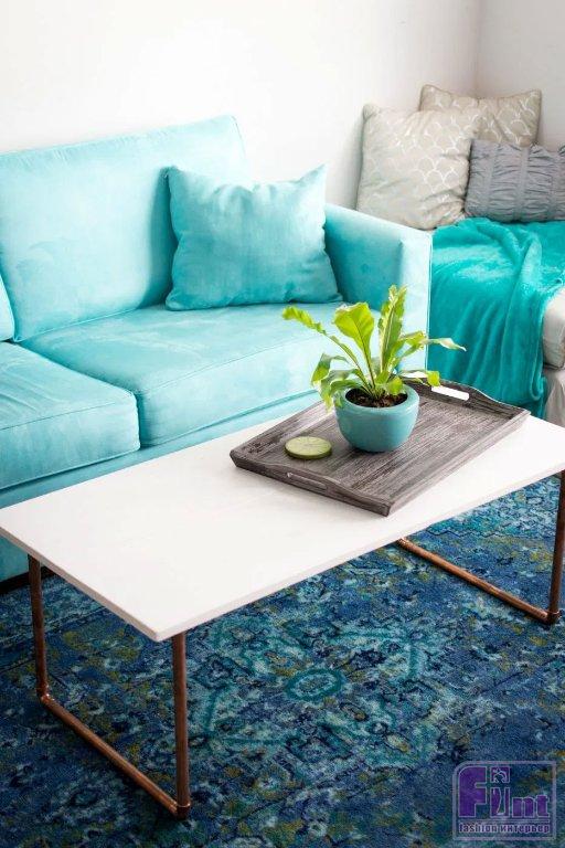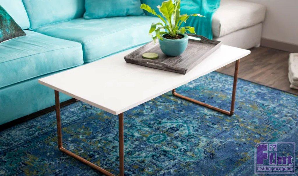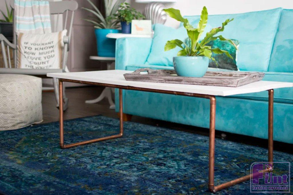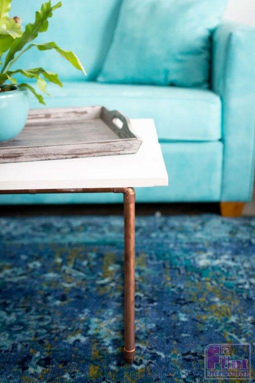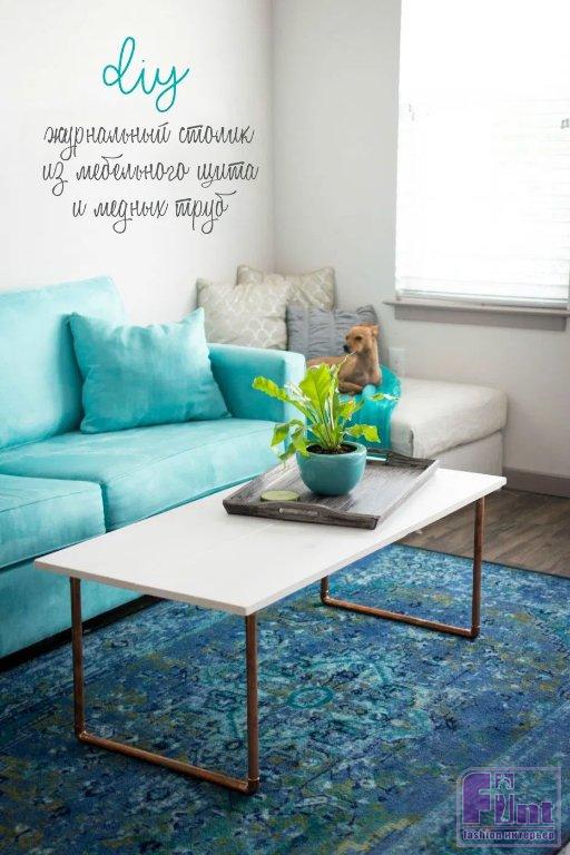 Зачастую, в продаже можно встретить очень красивые журнальные столики, которые стоят неприлично дорого. Чтобы не подвергать опасности ваш семейный бюджет, такой удивительно красивый и стильный столик в современном стиле можно без особого труда сделать своими руками, используя два небольших мебельных щита и немного медных труб с соответствующей фурнитурой. Сочетание благородной меди и крашеного дерева в этом предмете интерьера создают очень гармоничный внешний вид, способный вписаться в интерьер практически любого современного стиля. Особенно логично такой журнальный столик будет смотреться в интерьерах, выполненных в скандинавском стиле или стиле джапанди.