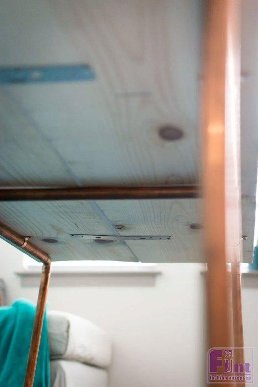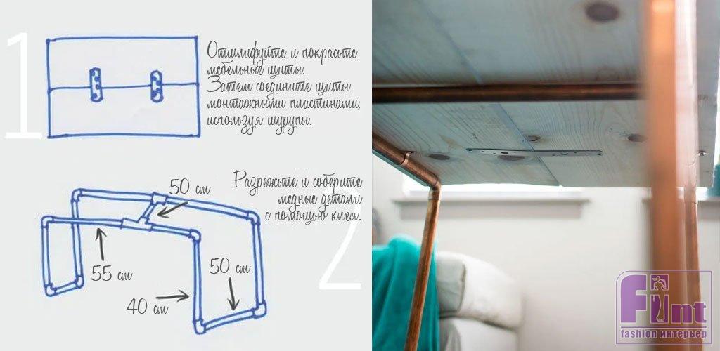 Соберите каркас из медных труб, как показано на чертеже. При необходимости добавляйте в места соединения труб и фурнитуры (уголки и тройники) немного специального клея. После того, как каркас будет собран, его останется лишь прикрутить к собранной столешнице при помощи медных хомутов.