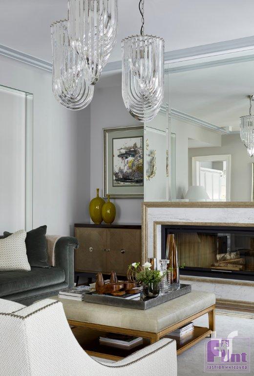 Так, на самых видных местах в доме развешены картины, выполненные в древнекитайской технике на натуральном шёлке, которые коллекционируют владельцы коттеджа. Каминный портал в гостиной на первом этаже особняка сделан из двух видов мрамора. По двум сторонам от камина висят картины из личной коллекции хозяев. Ещё одна малая гостиная расположилась рядом с хозяйской спальней.
