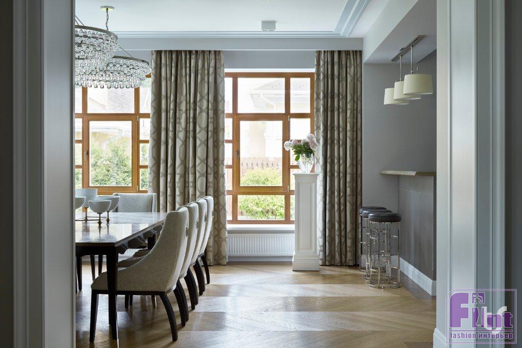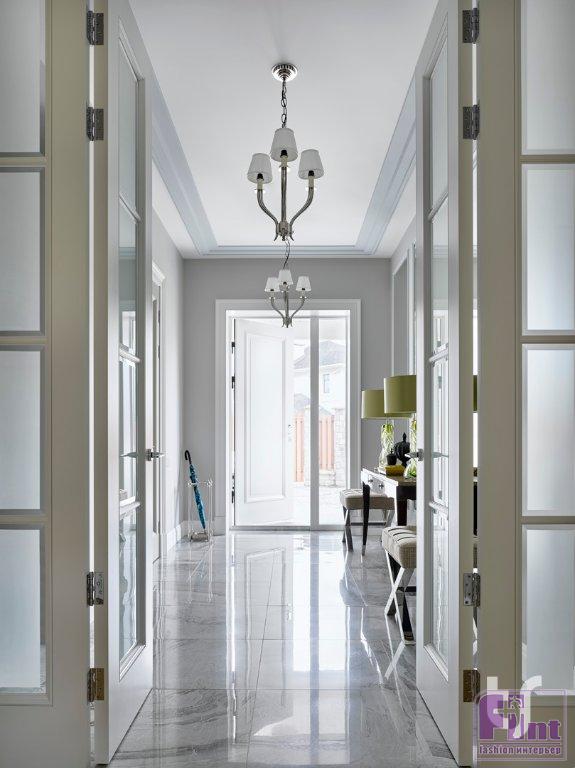 На первом этаже особняка были расширены помещения главной гостиной. Там же расположились и столовая с коридором. Между помещениями дизайнеры оставили широкие проёмы, которые вкупе со стеклянными панелями пропустили в дом много света и воздуха. Входную дверь высотой 240 см сделали с боковым остеклением — так в холл попадает больше естественного света. Второй и третий этаж перепланировали ещё серьёзнее, разбив его на два условных блока.