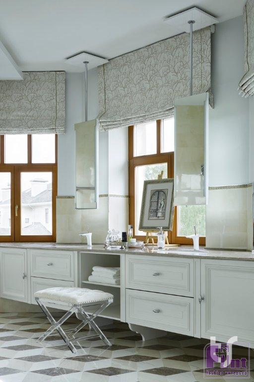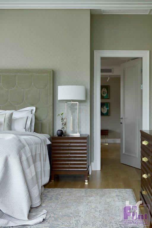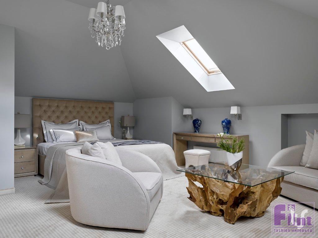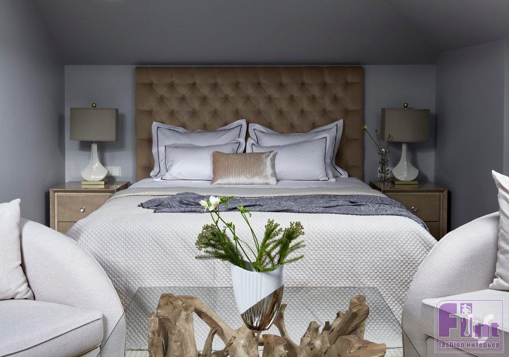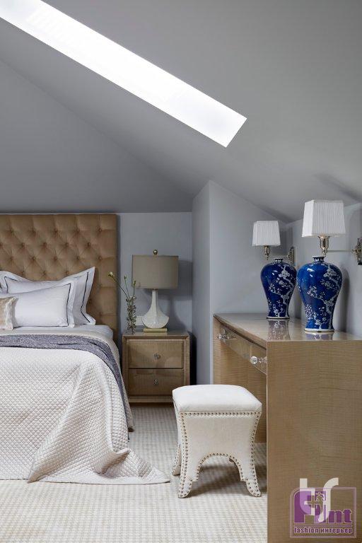 Хозяева этого коттеджа уже обращались в архитектурное бюро TS Design несколько лет назад для оформления интерьера квартиры. В этот раз задача стояла более сложная — уже готовый трёхэтажный дом требовал перепланировки, поскольку из-за расположения и размеров окон большинству помещений не хватало света, а площадь спален не позволяла разместить в них ни просторную кровать, ни гардеробную. Зато после перепланировки хозяйская спальня получила великолепное панорамное остекление по трём стенам с потрясающим видом на роскошный сад. Кровать изготовлена по эскизам дизайнеров.