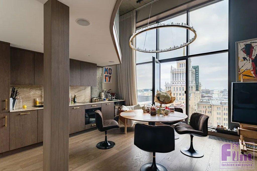 Двухуровневый видовой апартамент с панорамным остеклением расположен в районе Патриарших прудов. Высота потолков здесь 4,9 м, благодаря огромным окнам квартира днём залита солнечным светом. На первом уровне предусмотрены гостиная с зоной кухни-столовой, прихожая с функциональной системой хранения, гостевой туалет и лестница, ведущая на антресоль, в которой размещены спальня и санузел.