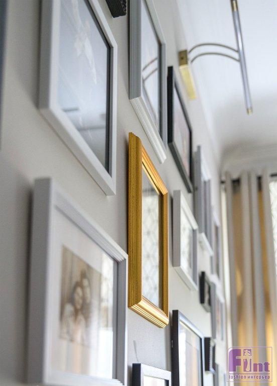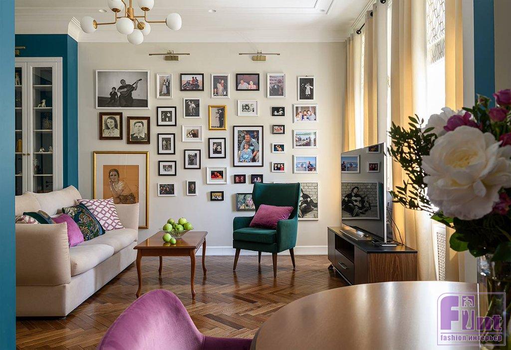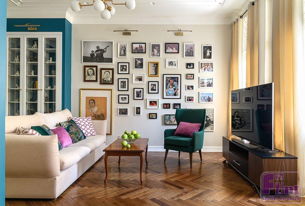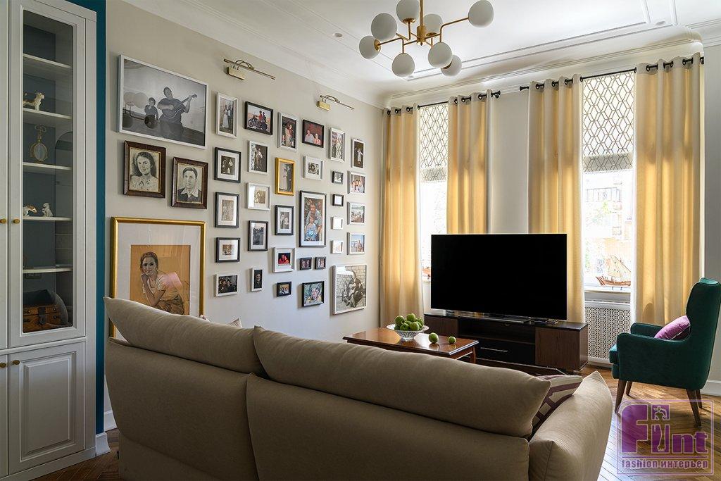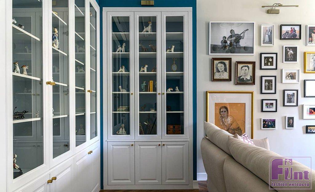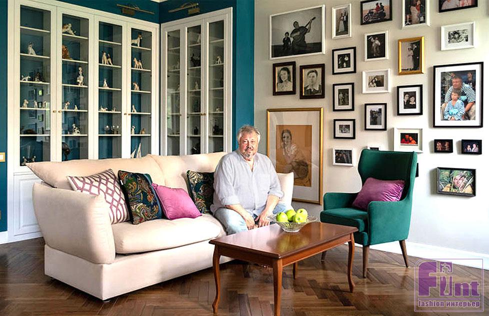 Для размещения в гостиной огромной коллекции фарфоровых статуэток дизайнеры заказали встроенные шкафы-витрины. Фасады шкафов выполнены из фрезерованного МДФ и покрыты плёнкой, а стёкла установлены в паз. Все двери оснащены доводчиками и декоративными ручками в форме цилиндров в цвете матового золота. Окна украсили хлопковыми римскими шторами с геометрическим рисунком. Дополнительно закрепили портьеры бежевого оттенка на люверсах. Семейные фотографии играют важную роль в оформлении интерьера. Их поместили в багеты разного размера, цвета и декора с обязательным паспарту. Для семейных фотографий актёра дизайнеры выделили целую стену в гостиной.