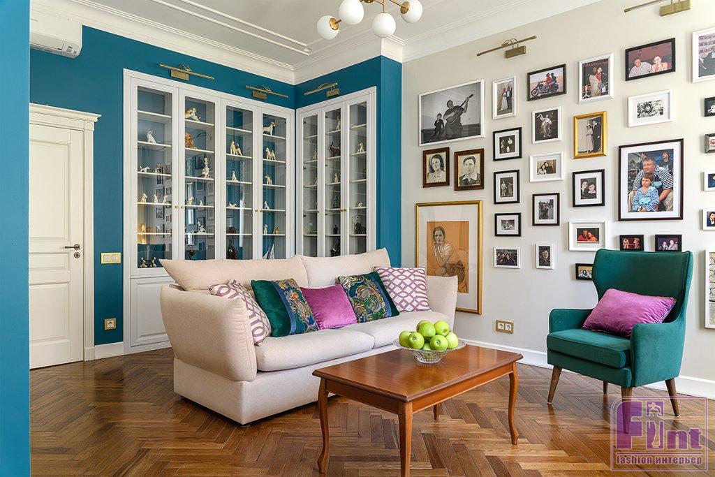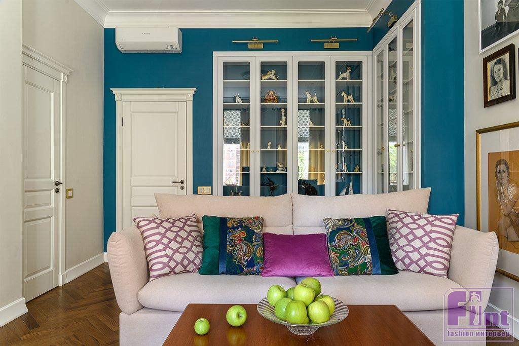 Для стен в гостиной выбрали достаточно смелое комбинирование глубокой морской синей краски, которая была модной в интерьерах 20-х годов прошлого века. Оттенок прекрасно сочетается с серой и льняной цветовой гаммой. Дизайнеры полагали, что такая комбинация напомнит Сергею Степанченко о родном Приморье.