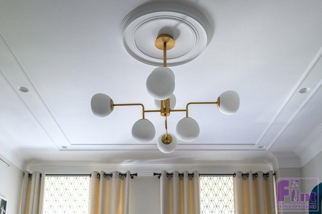 На потолке установили карнизы из лепнины полукруглой формы, которые стирают границы со стеной. Кроме того, они идеально перекликаются с линиями арки между кухней и гостиной. Исторический дух квартиры подчёркивают и молдинги, а также классическая розетка под люстру. Потолок покрасили английской экологически чистой краской белого цвета.