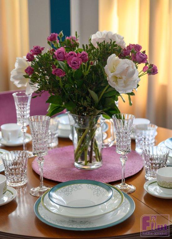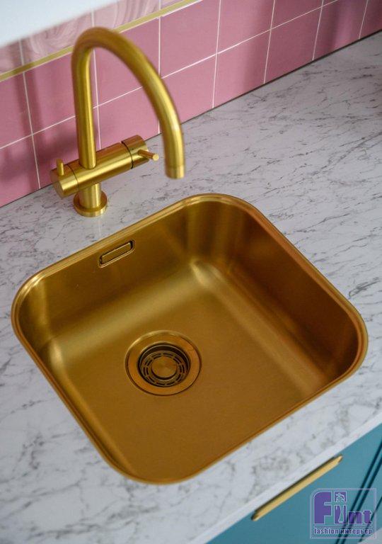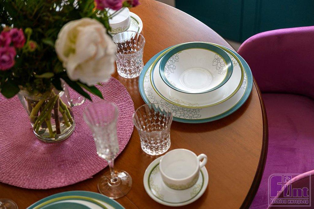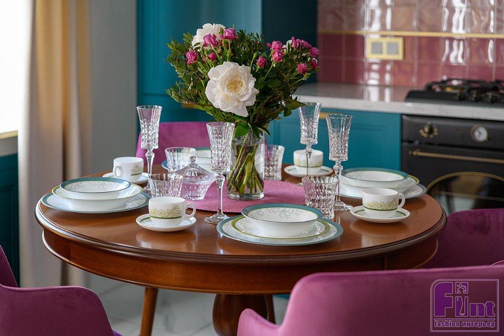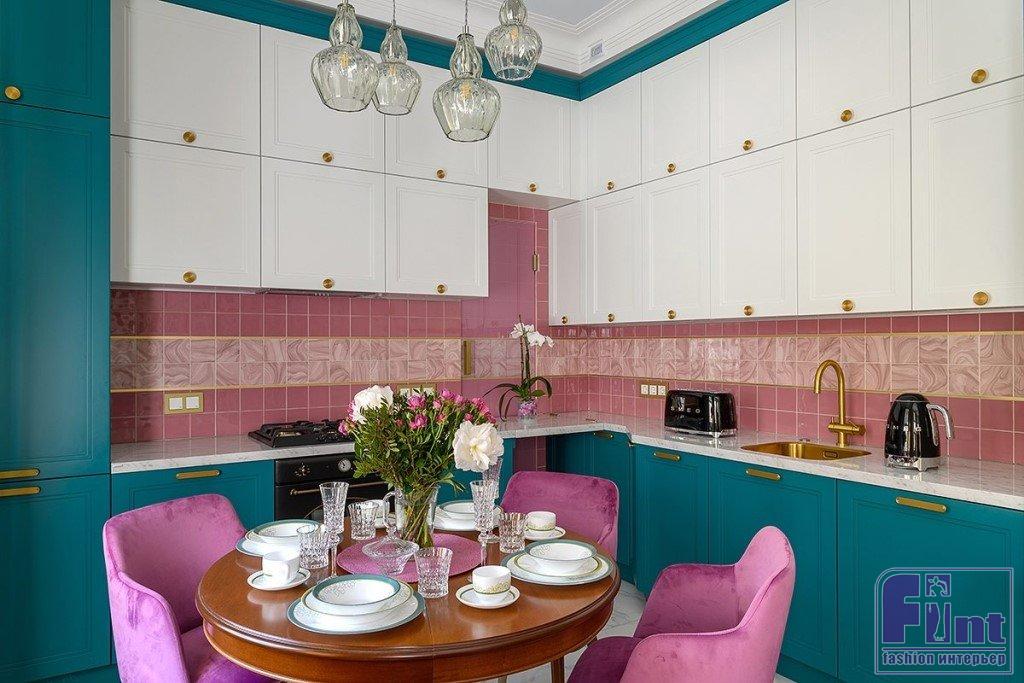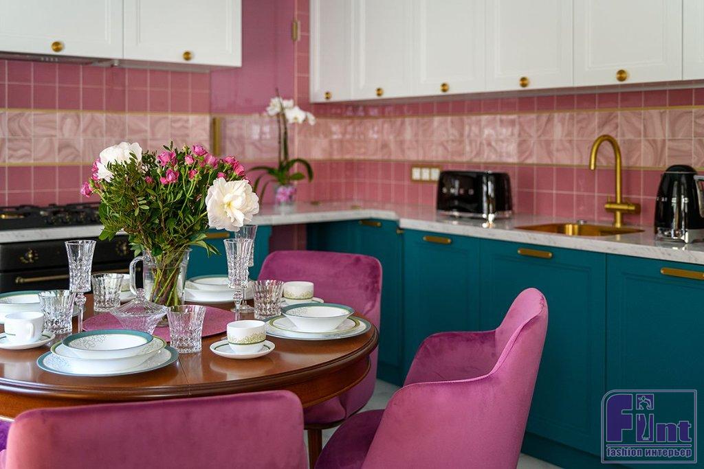 Кухонная мойка изготовлена из сплава стали и латуни, к ней идеально подобрали смеситель в оттенке античной латуни. Кухню оснастили самой современной техникой: измельчителем для бытовых отходов, варочной поверхностью и духовым шкафом чёрного цвета, а также встроенной вытяжкой. В обеденной зоне поставили круглый стол из массива бука, рядом разместили современные кресла с изогнутыми спинками и розовой велюровой обивкой. На кухне кроме центральной люстры установили два вида потолочных встраиваемых светильников.