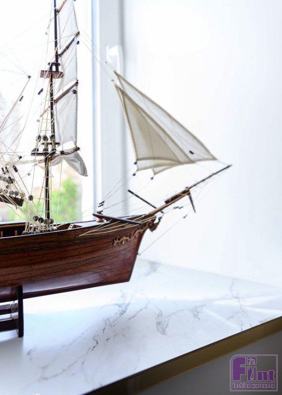 Новые розетки в золоте ярко выделяются на фоне синей стены. Их рамка изготовлена из матированной латуни, белые клавиши продолжают морскую тематику интерьера. Для кухни выбрали сдержанную и лаконичную люстру со стеклянными плафонами. В зоне кухни установили современную систему водного тёплого пола от скандинавского производителя. Сверху уложили плитку с имитацией белого мрамора из новейшей коллекции керамогранита. Она идеально сочетается с подоконниками из ламинированного ДСП с мраморным рисунком и золотистой кромкой.