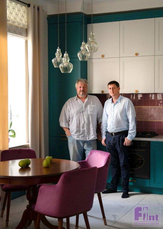 Кухня и гостиная изначально были объединены, и это отличное современное решение дизайнеры решили оставить. Общая площадь в 30 м² давала довольно скромное поле для творческой фантазии оформителей и дизайнеров. Немаловажным преимуществом была большая высота потолков, которую идеально декорировали лепниной и объёмными карнизами. В первую очередь мастера демонтировали старую отделку, установили новую электрическую проводку, бризер, сплит-систему и современную вентиляцию. Кабель-каналы закрепили на потолке, впоследствии они были спрятаны за натяжным полотном.