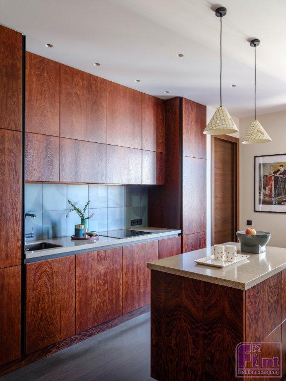 Интерьер общей зоны вобрал в себя два ключевых элемента — обилие дерева и свежие цвета, тем самым удовлетворив запросы обоих хозяев квартиры. Кухонный уголок, выполненный из дерева сочного оттенка, эффектно перекликается с мебелью и предметами декора в зоне гостиной, создавая живую и жизнерадостную атмосферу. Здесь есть акцентная стена — зелёная ниша выкрашена краской для мела, а напротив — ещё более акцентная ниша с кухней, которая своим цветом и активной фактурой дерева задаёт настроение всему интерьеру. Самый интересный предмет в зоне кухни-столовой — керамические абажуры, которые получились именно такими, как и задумывала Татьяна: как будто с потолка на тонком проводе свисает лёгкий бумажный лист в клеточку, свёрнутый конусом.