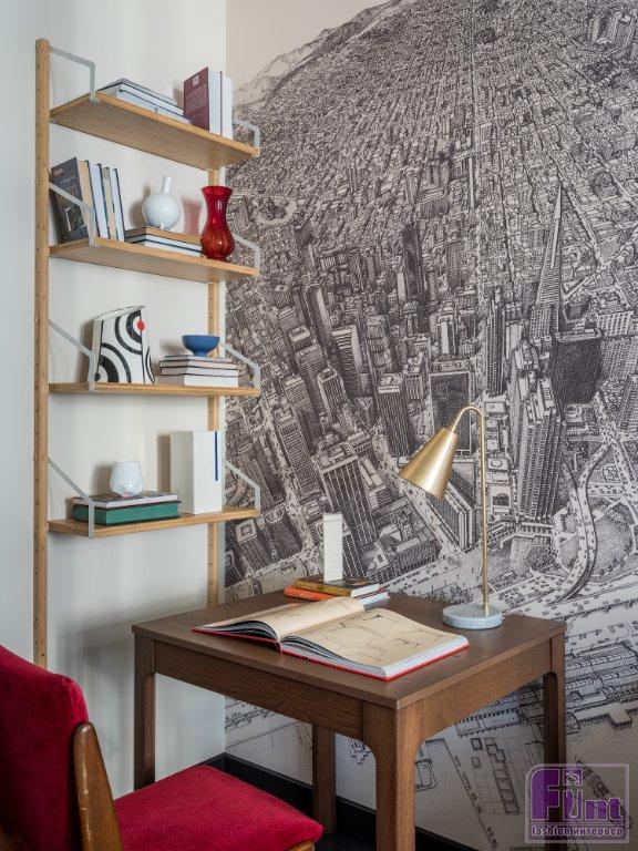 Кабинет хозяйки — лаконичное продолжение кухни-гостиной. Цвета светлее, а на стене — выполненные на заказ фотообои с напечатанной на них картой Сан-Франциско. Это ещё одно из пожеланий владельцев. В интерьере кабинета Татьяна также использовала свою картину «Путь», которую она нарисовала во время работы над этим проектом. Картина удивительным образом отлично вписалась в интерьер и полюбилась заказчикам.