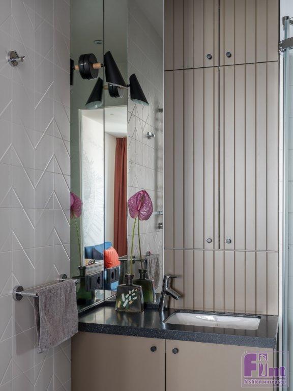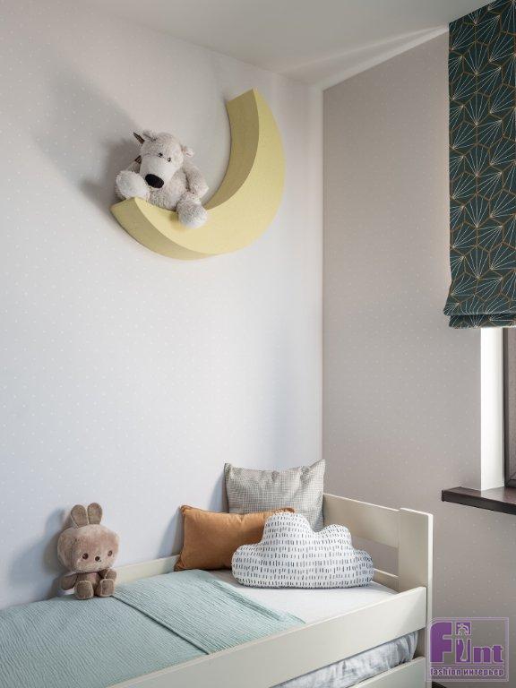 Детская комната получилась светлой с нежными цветными акцентами, а настроение всему интерьеру задаёт картонная авторская люстра, заслужившая особенную любовь хозяйки квартиры. Чтобы создать интерьер на вырост, дизайнер создала универсальный декор шкафа и ещё на этапе проекта выбрала идеальный для этого интерьера подвесной светильник. Он настолько запал в душу клиентки, что на момент заказа она не могла смотреть ни на что другое. Однако выбранная люстра уже была раскуплена по всей Европе. Тогда клиентка написала напрямую дизайнеру светильника, и тот помог приобрести чуть ли не последний экземпляр в этом цвете. Родственники клиентки посмеивались, так как, на их взгляд, картонная люстра не стоила такой суеты. И только когда весь интерьер собрали, все оценили совместные усилия хозяев и автора проекта по покупке этого дизайнерского светильника.