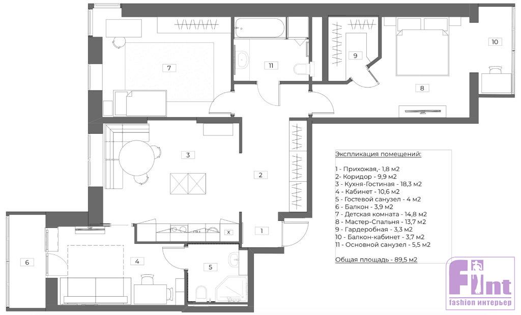 В итоге для каждого члена семьи — мамы, папы и маленького ребенка была разработана не только своя комната, но своя цветовая гамма. Чтобы успешно решить поставленную непростую задачу дизайнеру пришлось «смешать» трёхсоставной коктейль, в котором каждому из жильцов, включая ребенка, досталась комната, отвечающая его вкусам и пожеланиям.