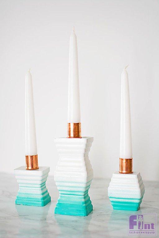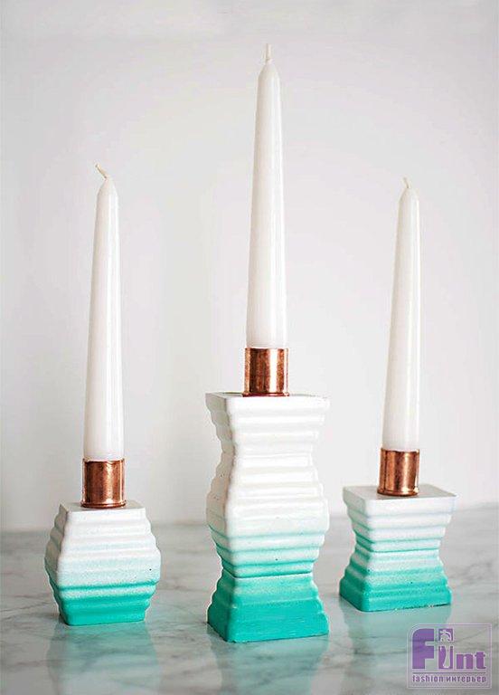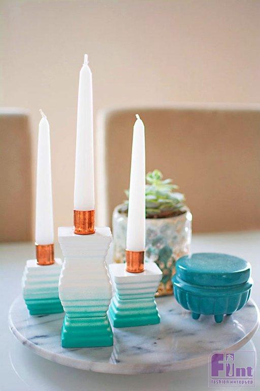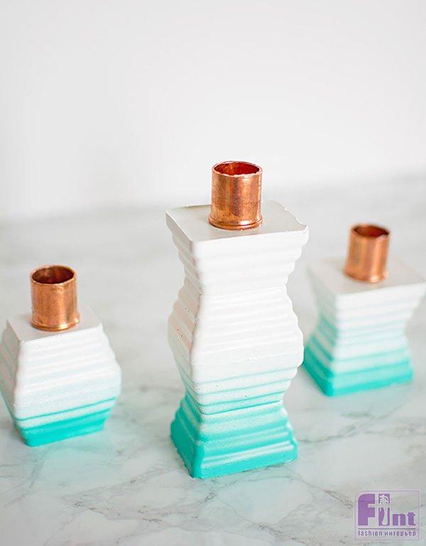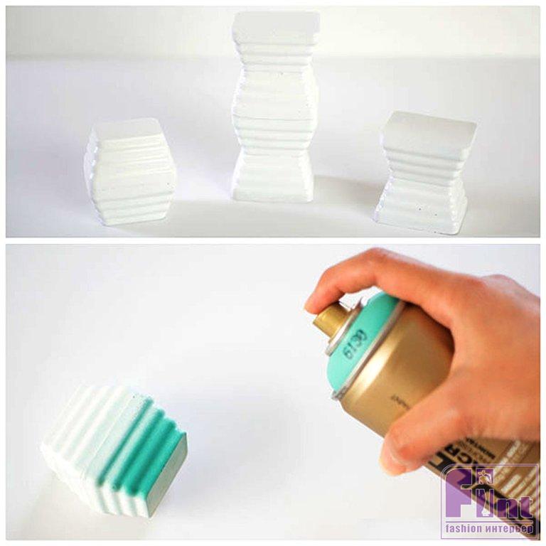 Пришло время для окрашивания. Если вас устраивает натуральный цвет высохшей цементной смеси, вы можете сразу приступать к окрашиванию подсвечников в технике омбре с плавным переходом цвета. Мы же сначала окрасили заготовки в белый цвет, а после высыхания оформили их в технике омбре, распылив краску на основание подсвечников, постепенно уменьшая количество краски.