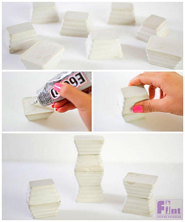 Получившиеся заготовки отлично выглядят сами по себе, но будучи соединёнными различными способами, способны превратиться в замечательные подсвечники. Наша формочка состояла из 8 ячеек, и в результате у нас получилось 8 заготовок. Две пары заготовок мы склеили при помощи супер-клея, соединив одну пару нижними, более широкими основаниями пирамидок, а вторую – верхними, более узкими. Третий подсвечник мы склеили из 4 заготовок, чередуя основания для склеивания, чтобы получился интересный по конфигурации столбик.