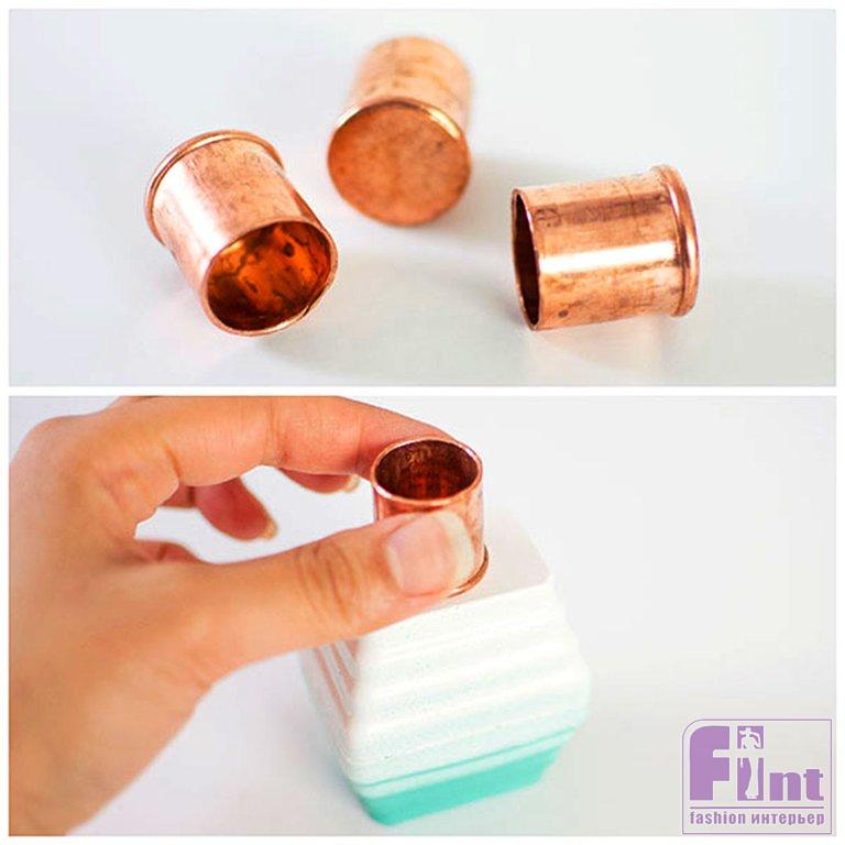 Чтобы завершить подсвечники, к их верхней части необходимо приклеить медные заглушки для водопроводных труб диаметром ¾ дюйма. Такие заглушки можно купить во всех магазинах строительных и отделочных материалов, имеющих отдел товаров для водоснабжения. Заглушки могут быть и пластиковыми, но нам очень понравились именно эти заглушки шикарного медного цвета.