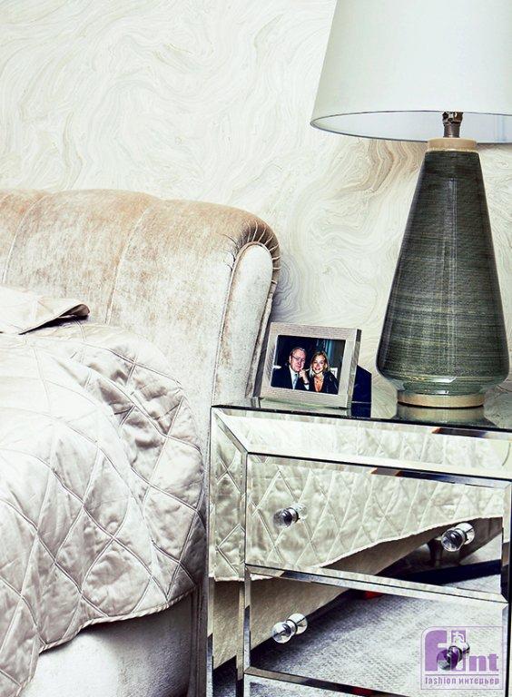 Рядом стоит комод с зеркальной поверхностью, которая выполнена из натуральной бронзы. Есть также небольшой журнальный столик с прозрачными деталями. Каждый элемент в помещении дополняет друг друга. На окнах висят портьеры в серой гамме и тюль белоснежного цвета. Зеркало обрамлено в привлекательную раму. Дизайн дополняют стильные мягкие декоративные подушки.