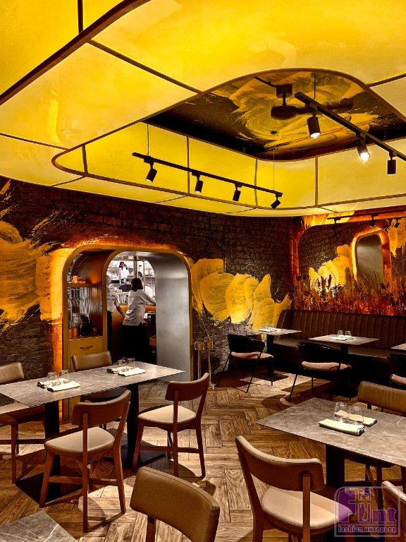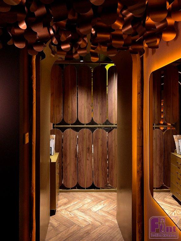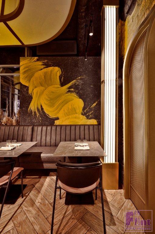 Пространство гастро-бистро, по замыслу Артемия, было разделено на 3 зоны: витражный зал, основной зал и зона кухни. Эти пространства логично соединяются между собой широкими арочными проходами. Тема полукруглых арок деликатно обыграна Артемием и в других элементах интерьера, таких как плавная светодиодная подсветка стен, зеркала со скруглёнными углами и особые потолочные светильники в форме замкнутых прямоугольников с радиусными углами. Планировка старого кафе кардинально поменялась: появился коридор, хостес и гардероб. Также дизайнер предусмотрел совершенно новую по идеологии посадку в залах и выполнил калибровку всех проёмов.