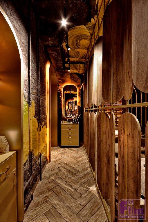Несмотря на то, что полы в заведении, в целом, остались без изменений, Артемию удалось реализовать красивое зонирование по полу. Большинство площади пола оформлена натуральным деревом в орнаменте классической английской ёлочки, хотя встречается и брутальный бетон. Стены в заведении разделены по образу хвоста из щупалец цианеи, на основе гранджевой фактуры поверхностей. Имплиментами выступают раковины и плитка из бетона, жёлтые потолочные световые элементы, винные шкафы с мягкой подсветкой и оригинальная роспись, визуализирующая грациозные движения щупалец медузы.