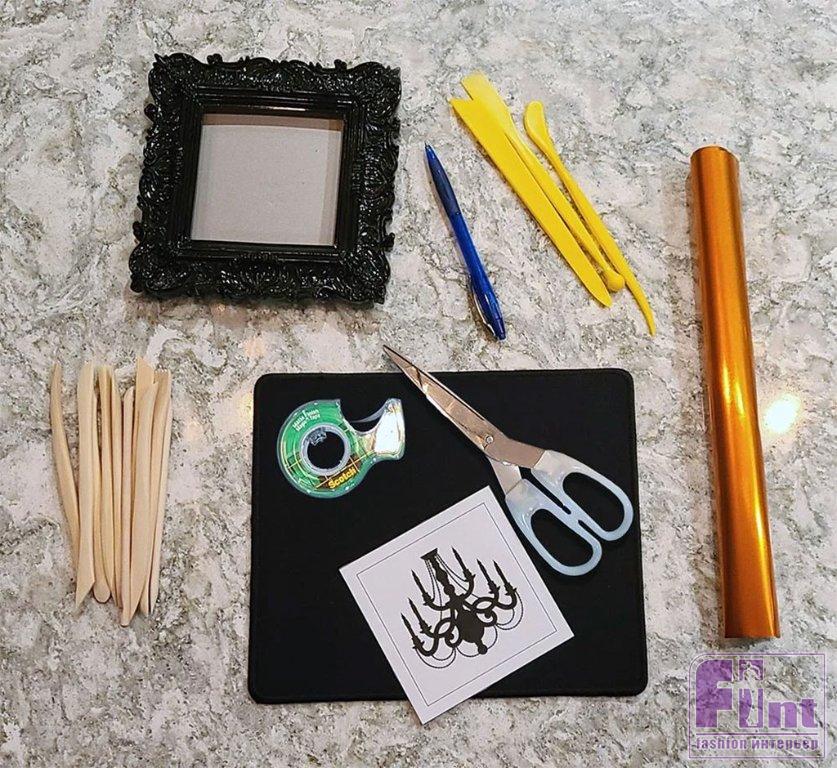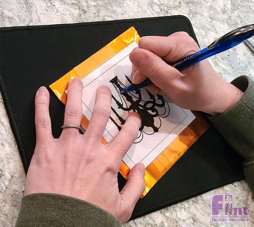 Для начала следует выбрать изображение, которое вы планируете воплотить в чеканке. Нам очень понравилось изображение старинной люстры, которое мы распечатали в масштабе, соответствующем по размеру нашей рамки для фотографий. Помните, что при переносе изображения, оно будет зеркально перевёрнуто, поэтому, если на вашем изображении есть буквы или слова, предварительно, перед печатью, переверните его, сделав «зеркальное отображение» в любом фоторедакторе. Наше изображение не содержит надписей и полностью симметрично, поэтому мы просто распечатали его, как есть.