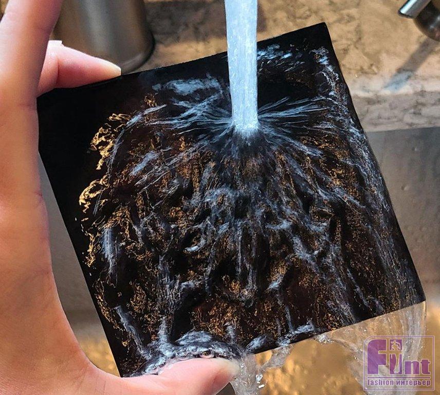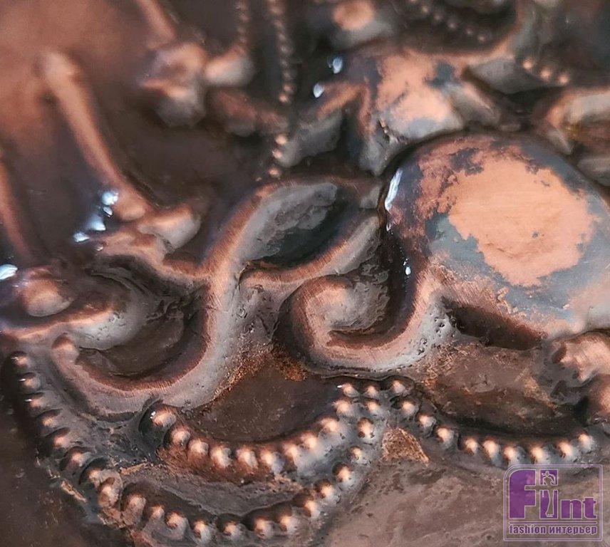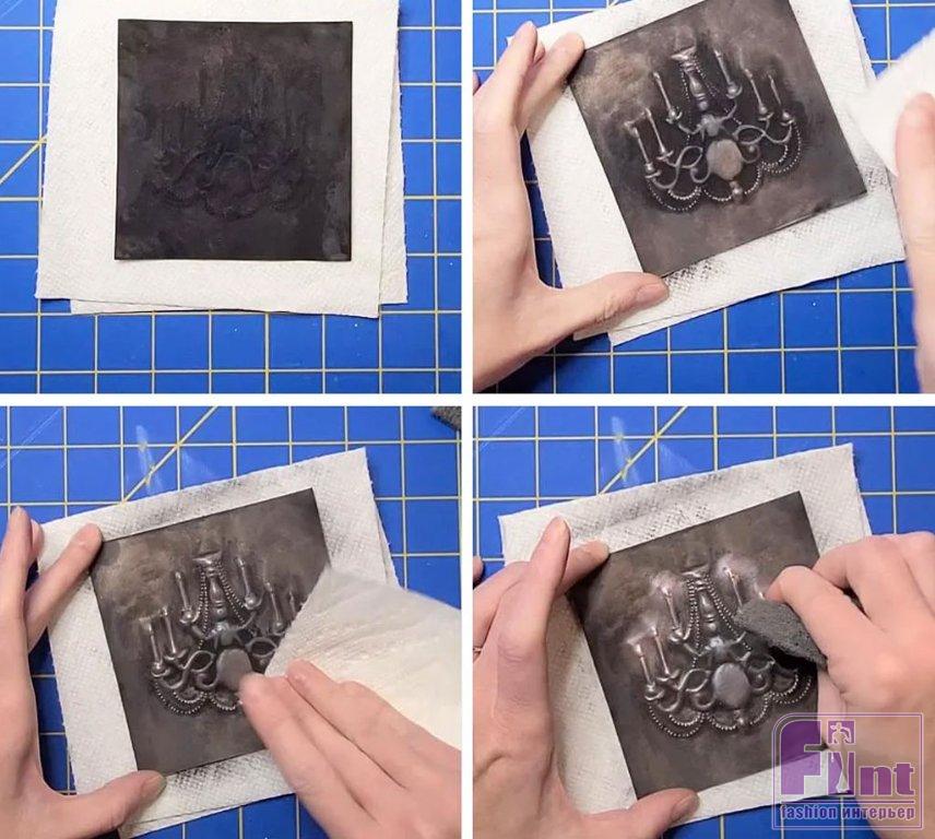 Как только чеканка полностью высохнет, вы можете придать её поверхности благородный состаренный вид. Затирание поверхности также позволит нам «проявить» выпуклые участки изображения. Начните затирание, используя бумажное полотенце, а затем подключите к работе губку для мытья посуды с жёсткой стороной. Не переусердствуйте. Оставляйте тёмные участки в углублениях чеканки, чтобы изделие получилось фактурным и объёмным.