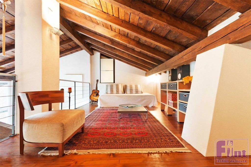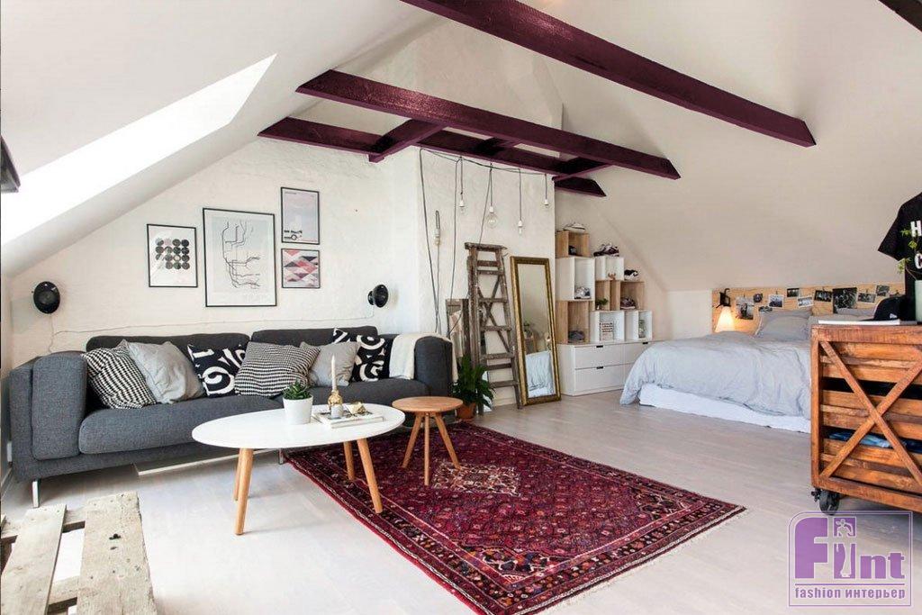 Ковёр на чердаке, который решили превратить в жилую комнату, поможет дополнительно утеплить пространство. Из-за близости крыши это помещение сложнее прогреть, а ходить по толстому ворсистому ковру будет ощутимо приятнее. Также ковер поможет зонировать небольшую комнату. Выбирайте размер ковра так, чтобы он покрывал не всю площадь пола. В свободных местах можно поставить кашпо с комнатными растениями, стеллаж с книгами или кресло.