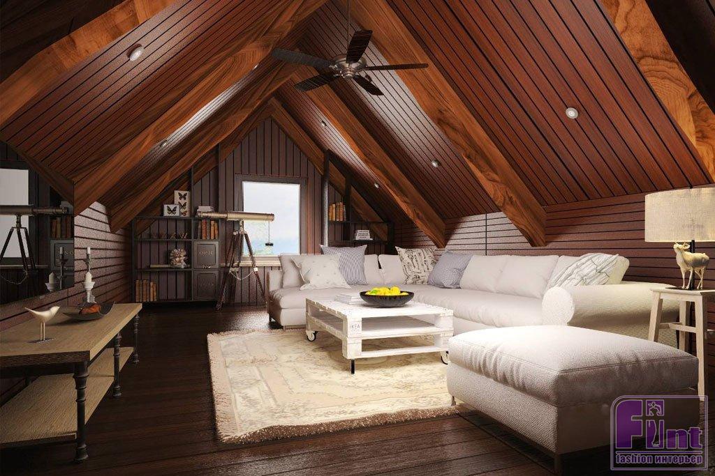 Если хотите сделать из чердака пространство для отдыха, смотрите на объёмную мягкую мебель. Например, длинный угловой диван, крупные пуфы. При расстановке не задвигайте мебель вплотную к стене. Из-за скошенной крыши есть шанс удариться головой при попытке резко встать. А еще свободное пространство между стеной и крупным диваном создаст дополнительное ощущение простора и воздушности. Не забывайте про декоративный текстиль: ковер, пледы и диванные подушки. Они придадут интерьеру ощущение завершенности. Единственная проблема – как затащить большой диван на чердак, особенно, если на него ведёт узкая лестница и небольшая дверь.