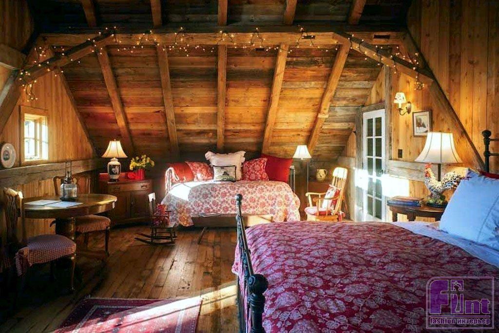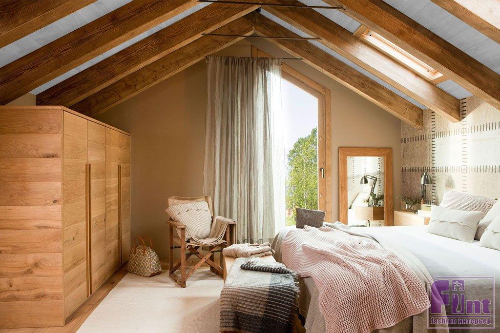 Декоративные балки добавляют особой атмосферы любому чердачному помещению в загородном доме. Но на фоне деревянной крыши такие же балки под дерево (или из натурального дерева) будут выглядеть не так эффектно. И потолок может «давить» из-за насыщенного цвета и ярко выраженной фактуры. Попробуйте покрасить основную часть потолка в белый цвет. Это визуально приподнимет его высоту и сделает комнату просторнее. А выступающие балки оставьте в цвете дерева. Они добавят интерьеру глубины и естественности. Для большего контраста можно затемнить балки, окрасив их почти в чёрный цвет, или же сделать акцентное окрашивание ярким и насыщенным тоном краски.