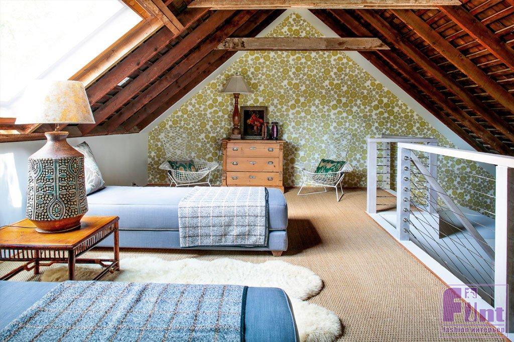 Из-за необычной геометрии чердака в нем хорошо смотрятся акценты на стенах. Их можно сделать с помощью фотообоев с напечатанными изображениями или цветной краски. Фотообои для чердака на даче лучше всего выбрать на основе стеклообоев, отказавшись от привычных бумажных вариантов. Стеклообои не боятся перепадов температур, которые на чердаках не редкость, и отлично предохраняют стены от трещин. Приём создания ярких акцентных стен поможет сместить фокус внимания с низких потолков и непривычной формы комнаты. Получится более сбалансированное и гармоничное пространство.