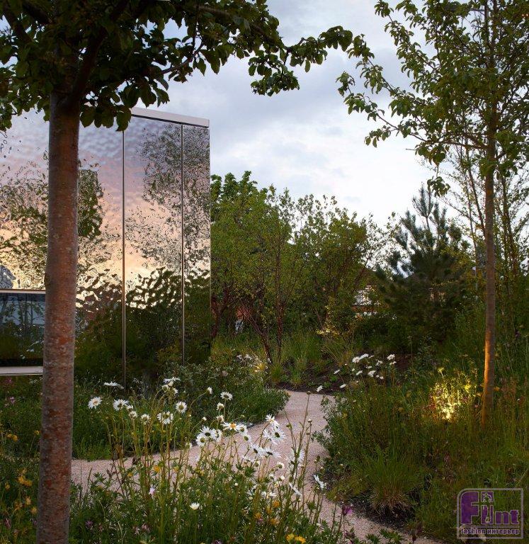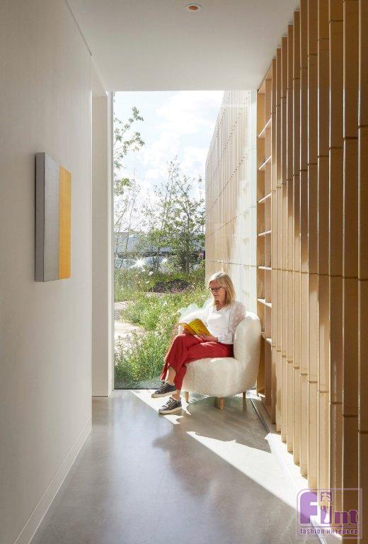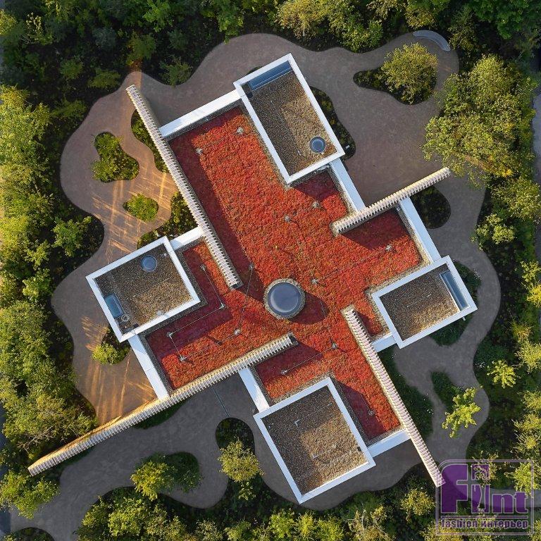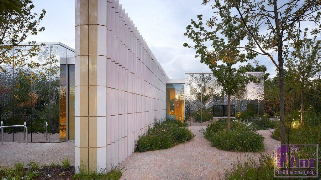 В четырех блоках находятся частные комнаты центра, снаружи облицованные нержавеющей сталью — благодаря фактурной поверхности отражение сада играет новыми красками. Создается ощущение, будто вы попадаете в королевство кривых зеркал. У решения есть и другая функция: в зеркальные поверхности могут врезаться птицы, и архитекторы заранее предотвратили проблему, изменив отражающую способность облицовки.