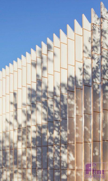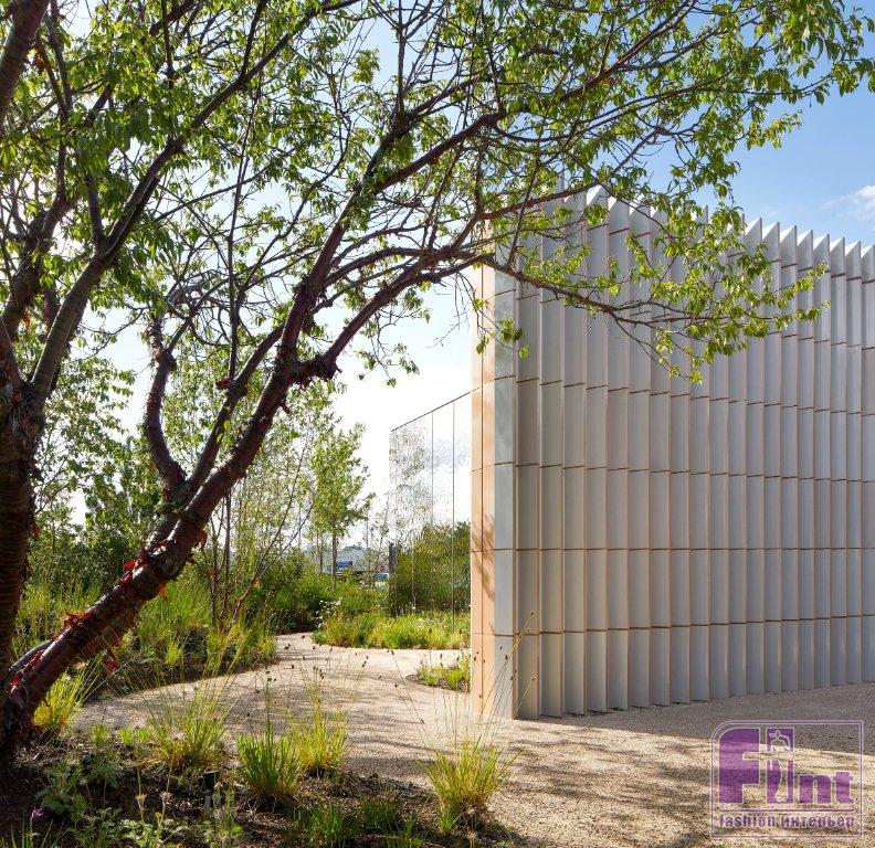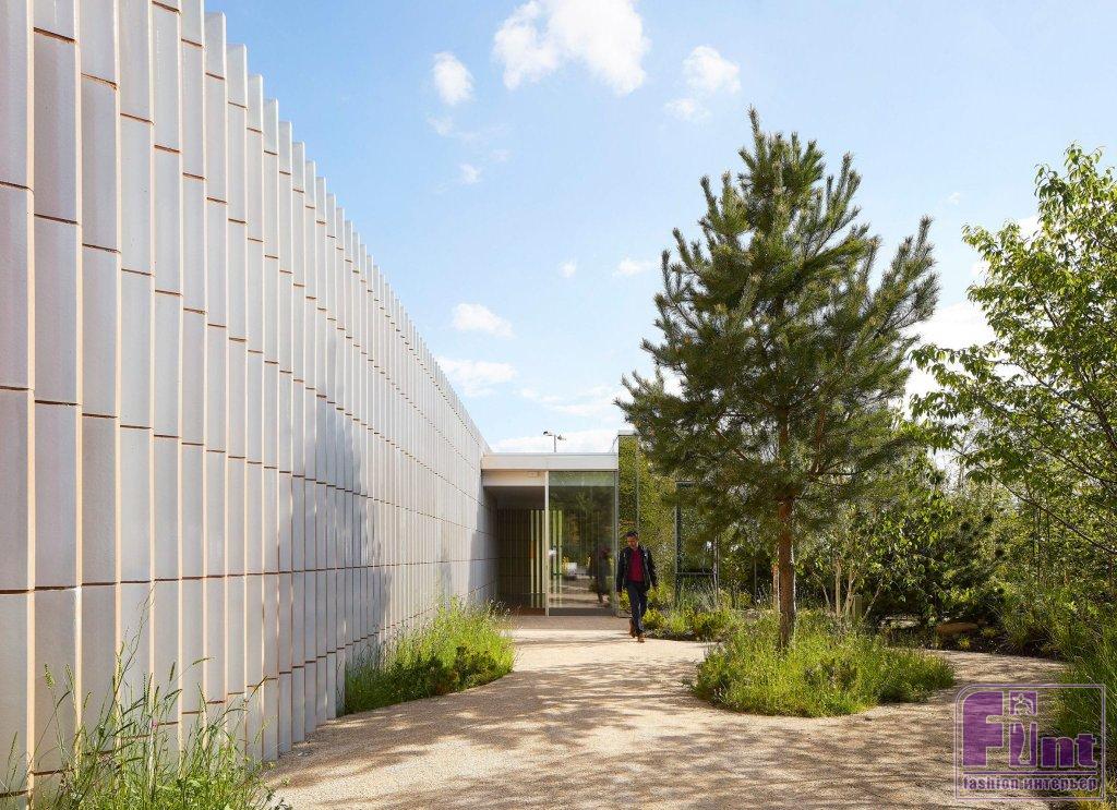 AL_A часто использует керамику в качестве облицовки в своих проектах, включая MAAT в Лиссабоне и V&A Exhibition Road Quarter в Лондоне. Однако в этой схеме керамика была разработана в сотрудничестве с Ceramica Cumella для двойного использования в качестве несущих и изолирующих конструктивных элементов. Параллельно четырём облицованным керамикой стенам идут четыре прямолинейные коробки. Они содержат частные комнаты центра и предлагают посетителям центра как акустическую, так и визуальную конфиденциальность. По словам AL_A, это «единственные узнаваемые формы зданий» снаружи, и поэтому они были покрыты отражающими поверхностями из нержавеющей стали, чтобы помочь им слиться с садами.