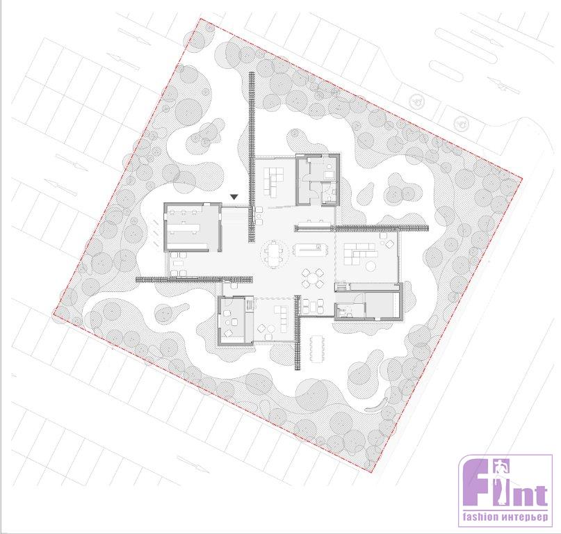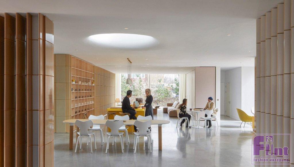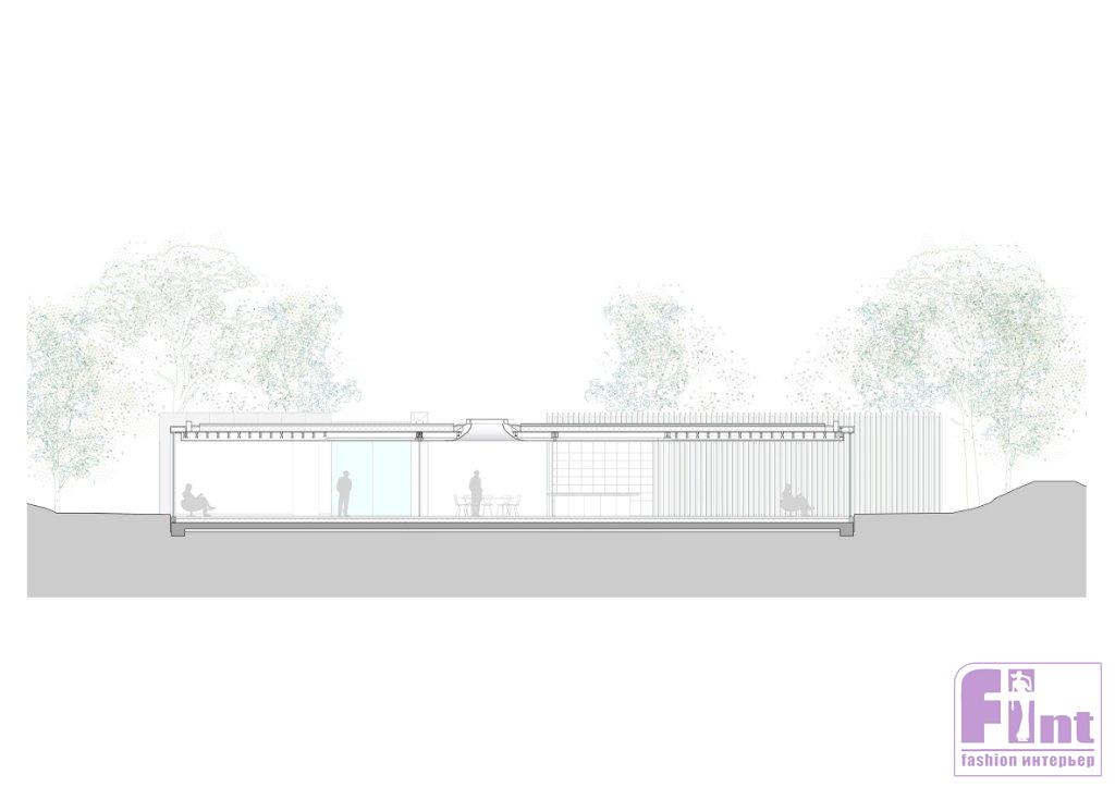 Одноэтажное здание спланировали так, чтобы внутреннее и внешнее пространство находились в постоянном взаимодействии. Четыре зоны объединены центральной точкой: в ней находятся общая кухня и обеденные столы. Отвесные стены из керамических блоков играют роль разграничителей и слегка выходят за пределы здания, деля сад на отдельные участки.