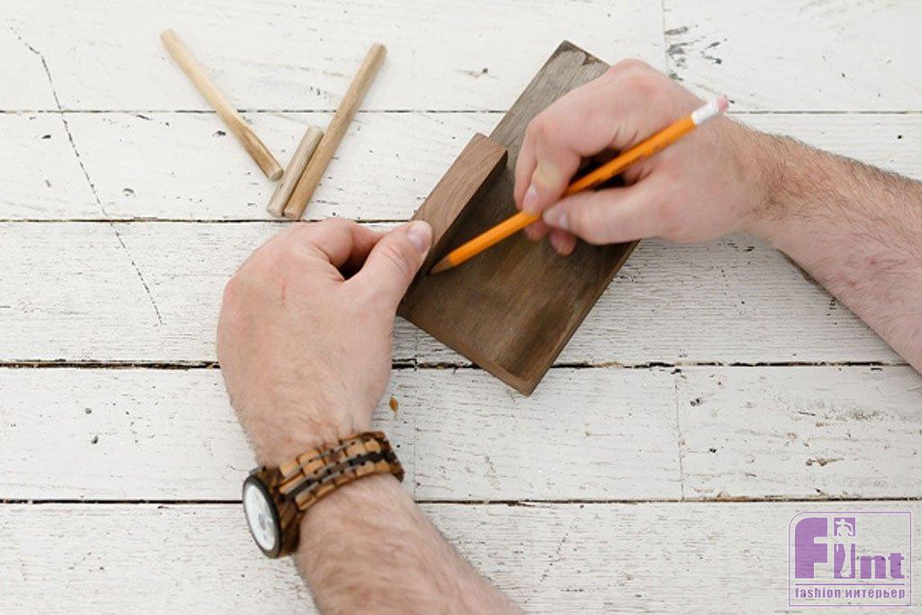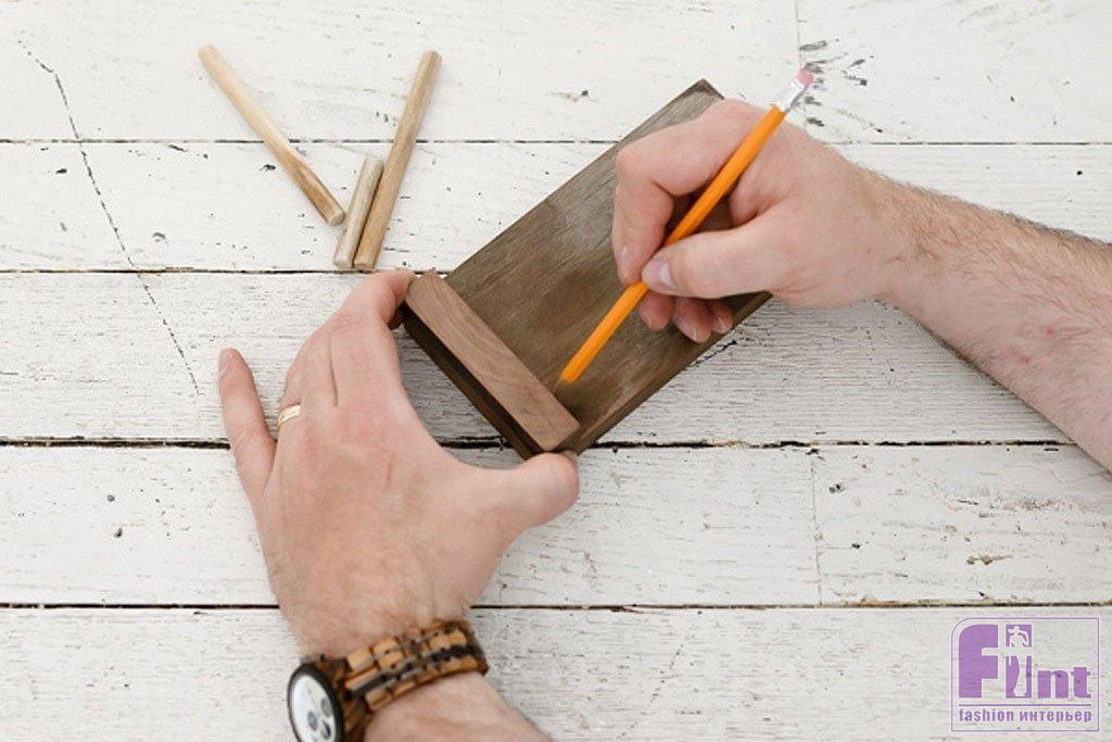 Чтобы отметить, где вы хотите просверлить отверстия для круглых палочек, используйте предварительно отрезанный небольшой деревянный брусок квадратного сечения со стороной 1,2 – 1,3 см. Приложите его к нижней части деревянного бруска под телефон и отметьте карандашом. Затем приложите тот же брусок к длинной стороне основы и повторите разметку карандашом, чтобы линии пересеклись. Аналогично сделайте отметку с противоположной длинной стороны бруска. С помощью зажима или струбцины прижмите брусок квадратного сечения приблизительно на расстоянии 3 мм от нижней части основного бруска под телефон, чтобы просверлить эти две детали одновременно.