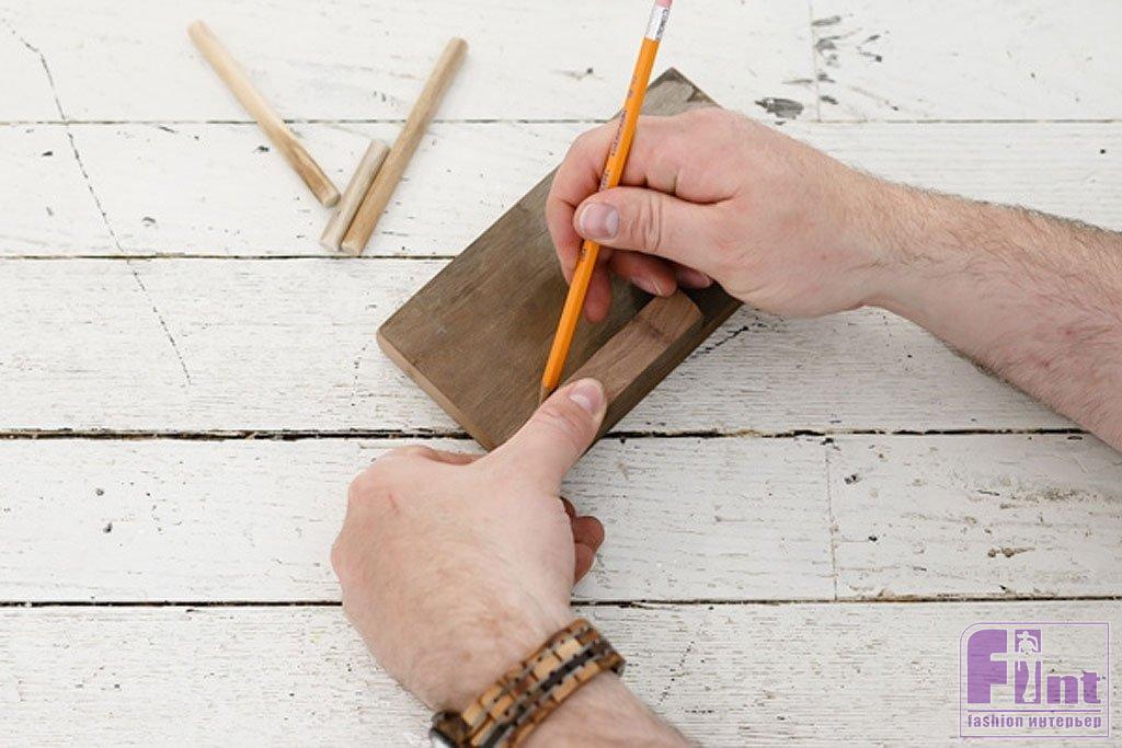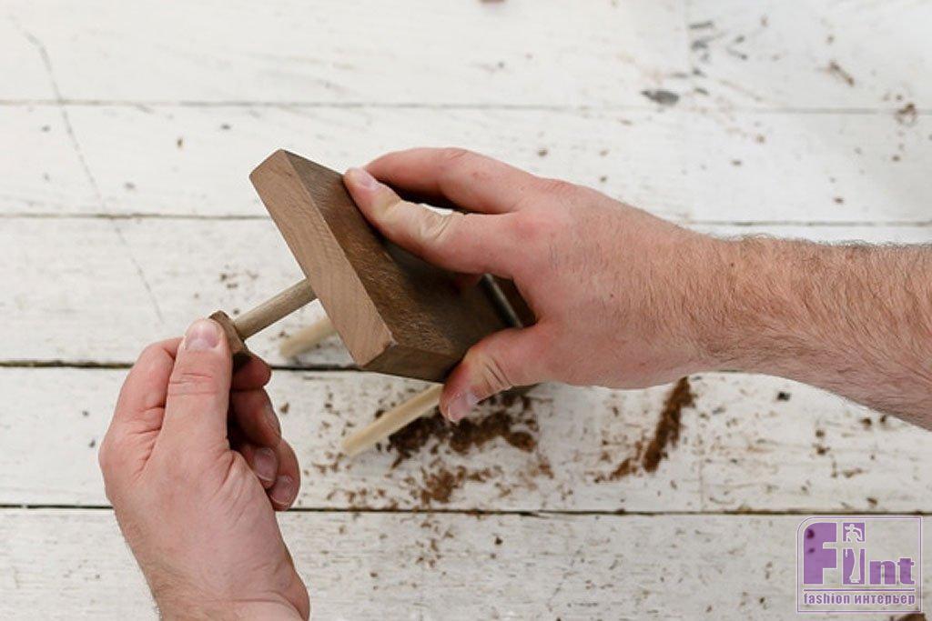 Мы решили украсить эту палочку-держатель, для чего использовали отрезок бруска кубической формы. Просверлите в нём небольшое углубление и при помощи клея присоедините его к концу круглой палочки. Если у Вас есть деревянная бусина достаточно большого диаметра, вы можете использовать её.