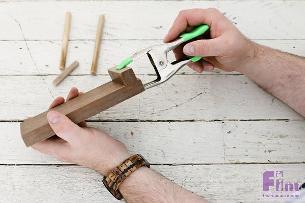 Примерьте брусочек квадратного сечения к торчащим концам круглых палочек. Если всё стоит ровно, используйте клей для дерева, чтобы собрать детали воедино.