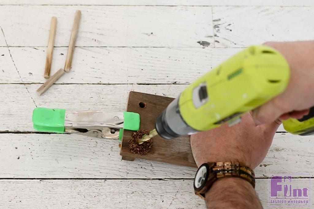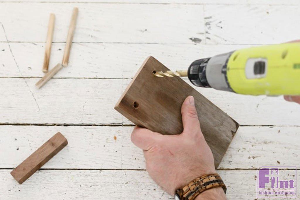 Отметьте и просверлите углубление приблизительно на расстоянии 2 см от верхнего края основной детали с её обратной стороны, не просверливая отверстие насквозь. Это углубление нужно просверлить примерно под углом 25 градусов, чтобы держатель для часов или других аксессуаров в итоге, с учётом наклона основной подставки, был расположен горизонтально. Промажьте клеем для дерева отверстие и короткую палочку круглого сечения, и вставьте её в просверленное углубление.