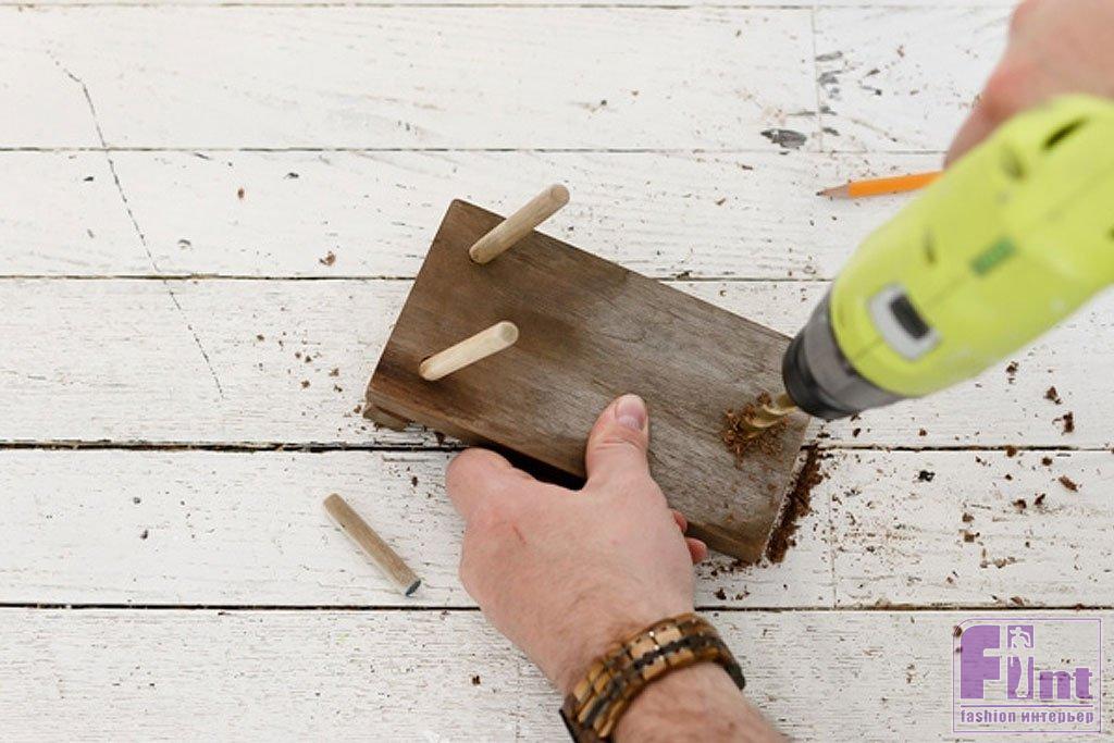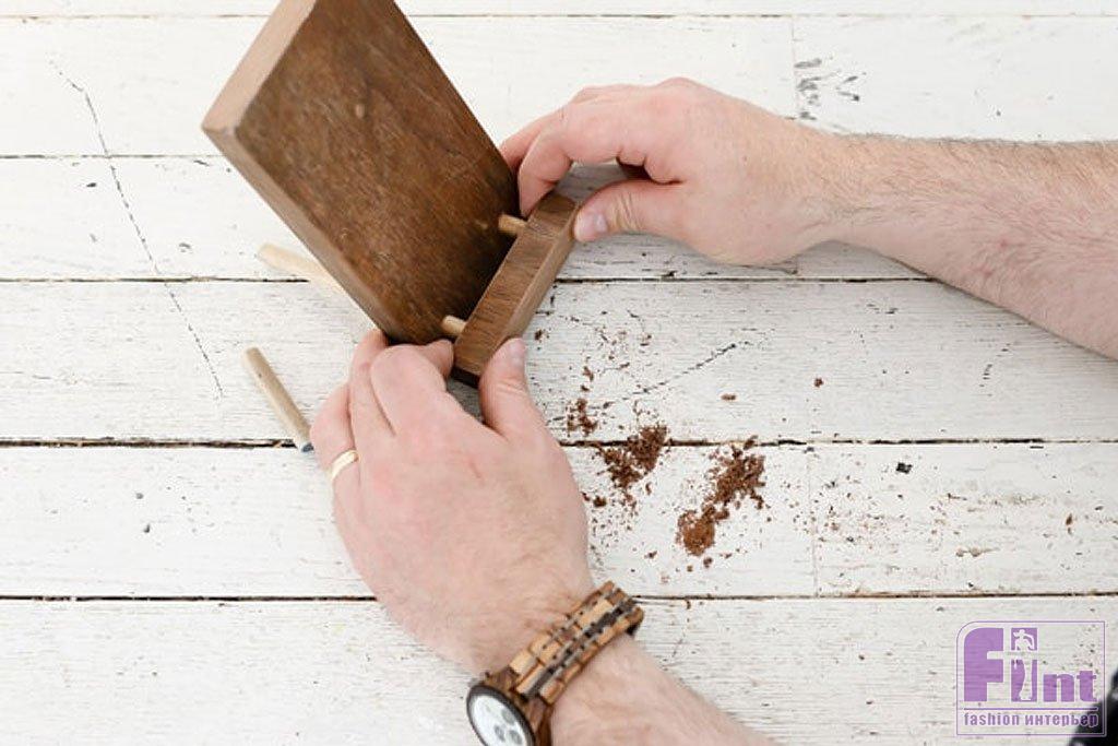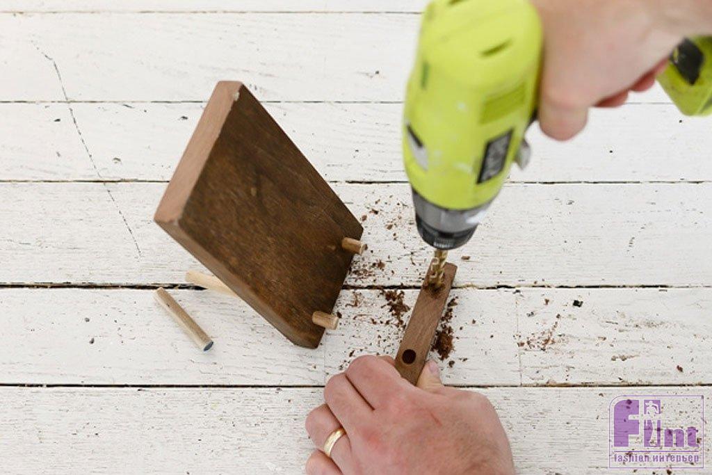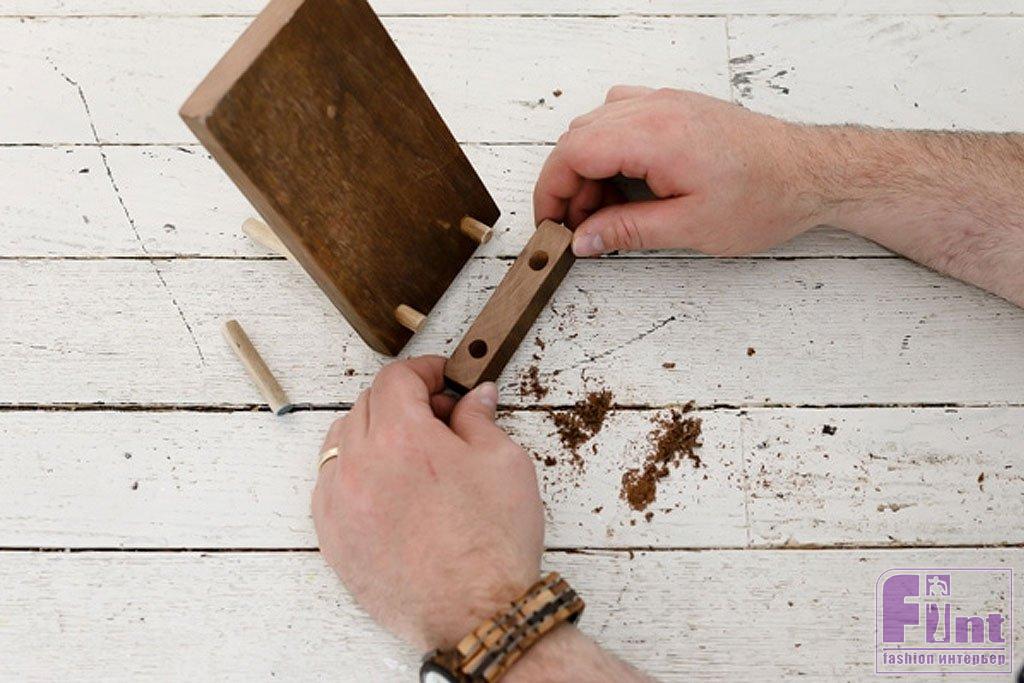 Просверлите 2 отверстия примерно под углом 15 градусов с обратной стороны большого бруска будущей подставки. Саму подставку просверлите насквозь, а меньший брусок нужно будет лишь коснуться кончиком сверла, чтобы наметить места сверления углублений. Затем снимите брусочек квадратного сечения и углубите в нём отверстия, примерно наполовину бруска. Вставьте дюбели в большую деталь, чтобы они торчали из неё с лицевой стороны приблизительно на 1,2 см.