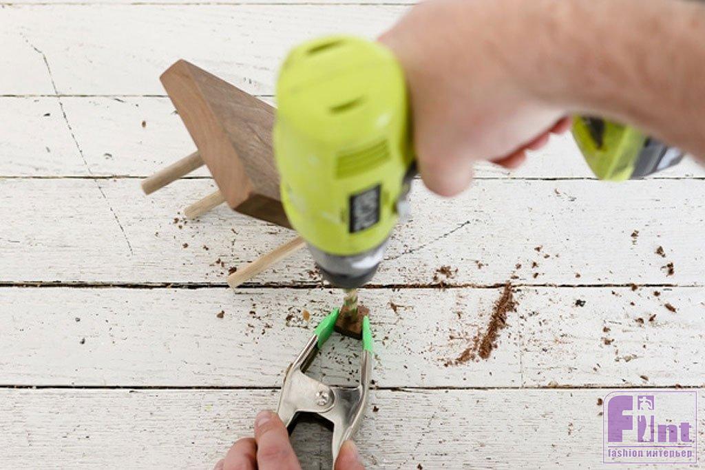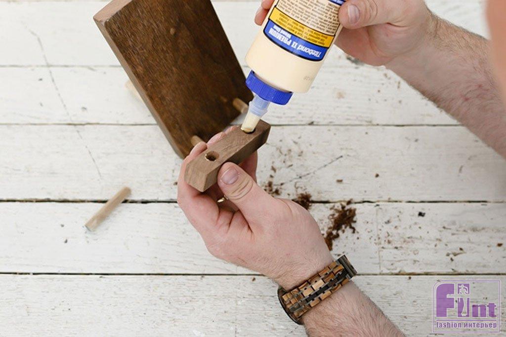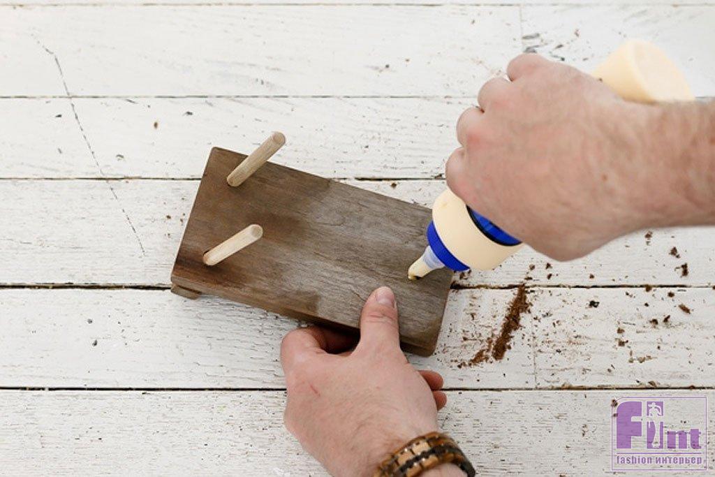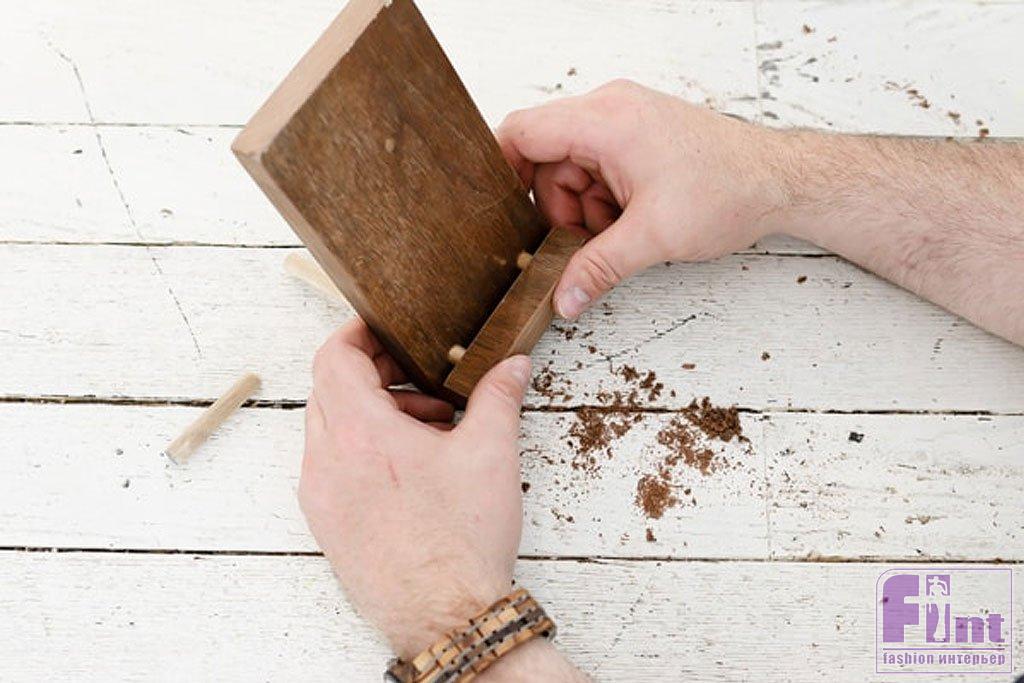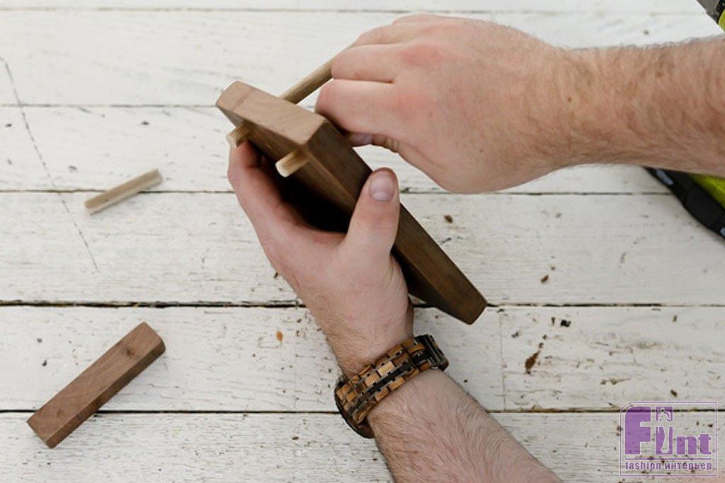 Просверлите 2 отверстия примерно под углом 15 градусов с обратной стороны большого бруска будущей подставки. Саму подставку просверлите насквозь, а меньший брусок нужно будет лишь коснуться кончиком сверла, чтобы наметить места сверления углублений. Затем снимите брусочек квадратного сечения и углубите в нём отверстия, примерно наполовину бруска. Вставьте дюбели в большую деталь, чтобы они торчали из неё с лицевой стороны приблизительно на 1,2 см.