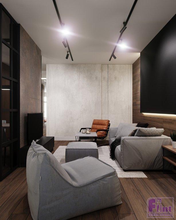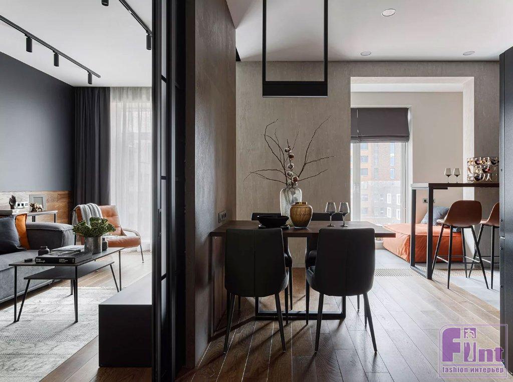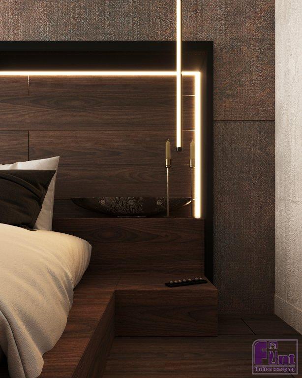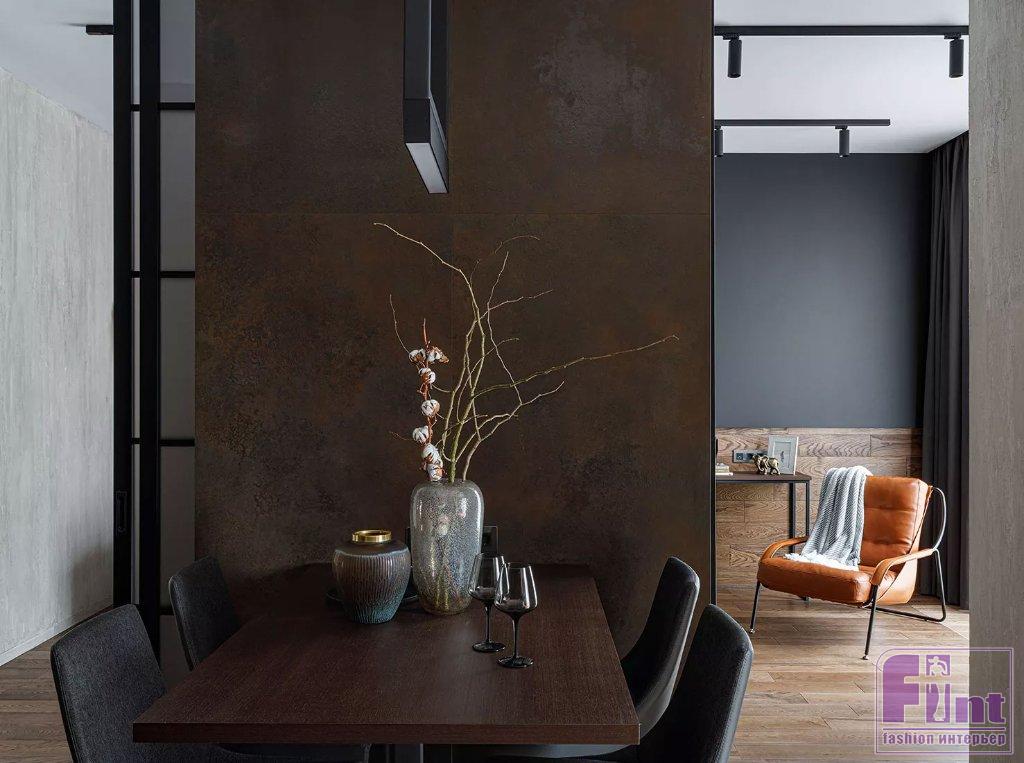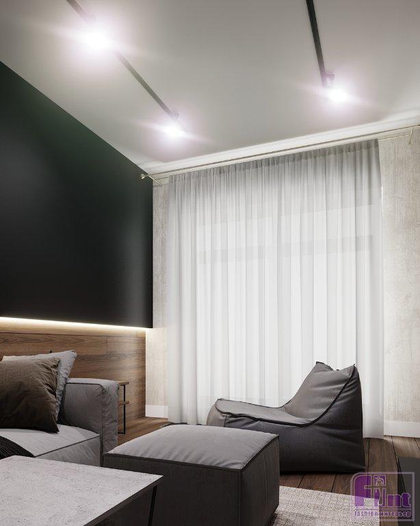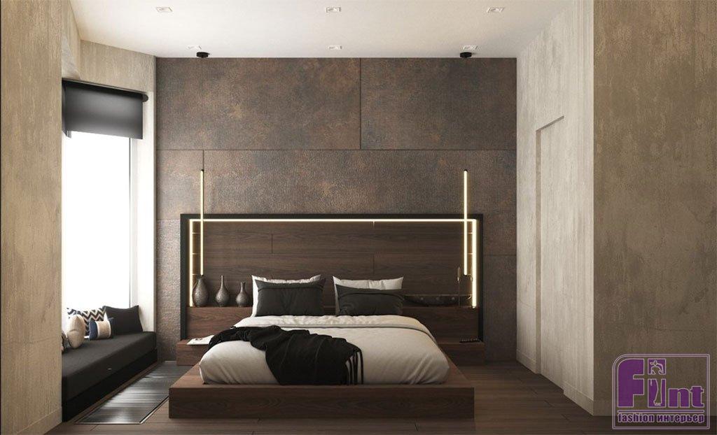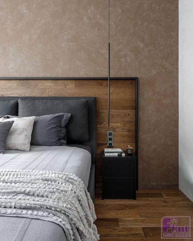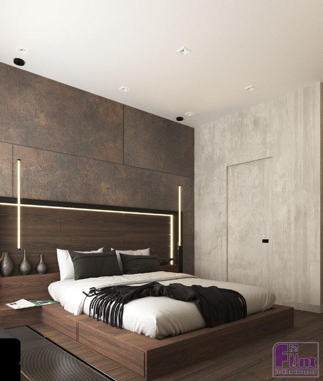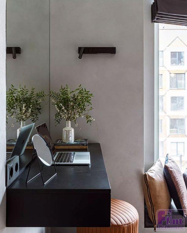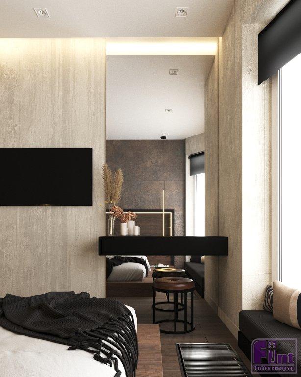 Выбор отделочных материалов продиктовала концепция: стены в общей зоне выполнены в декоративной штукатурке, имитирующей бетон, в спальне отделка более нейтральна с акцентной стеной в терракотовом оттенке. Акцентная стена за изголовьем дополнена линейными светодиодными светильниками и ленточной подсветкой по контуру изголовья. Сама кровать спроектирована в виде подиума и не имеет привычных для этой мебели ножек. В углу спальни дизайнер установила огромное зеркало от пола до потолка, дополненное консольным столиком и стильным табуретом округлой формы.