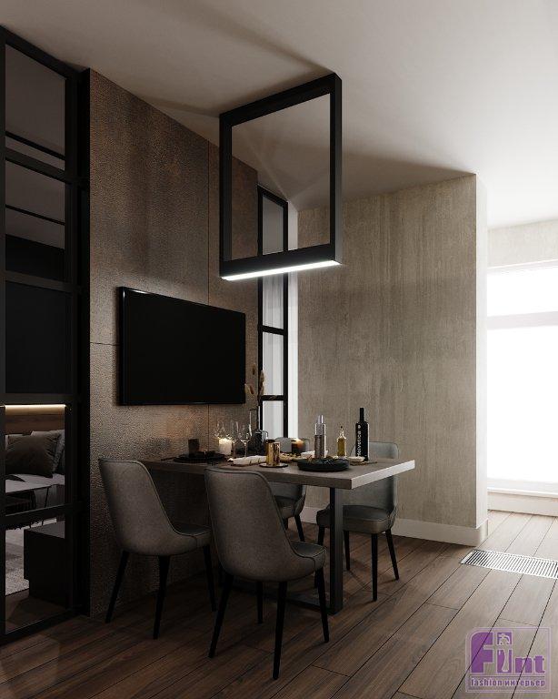 Огромные окна квартиры выходят на две стороны, благодаря чему создавалось логичное зонирование, в результате которого был сформирован приватный блок, отделённый от гостевого пространства. Дополнительным элементом зонирования стала раздвижная конструкция между гостиной и кухней, а использование «бесшовных» зеркал во всю стену зрительно увеличило пространство квартиры.