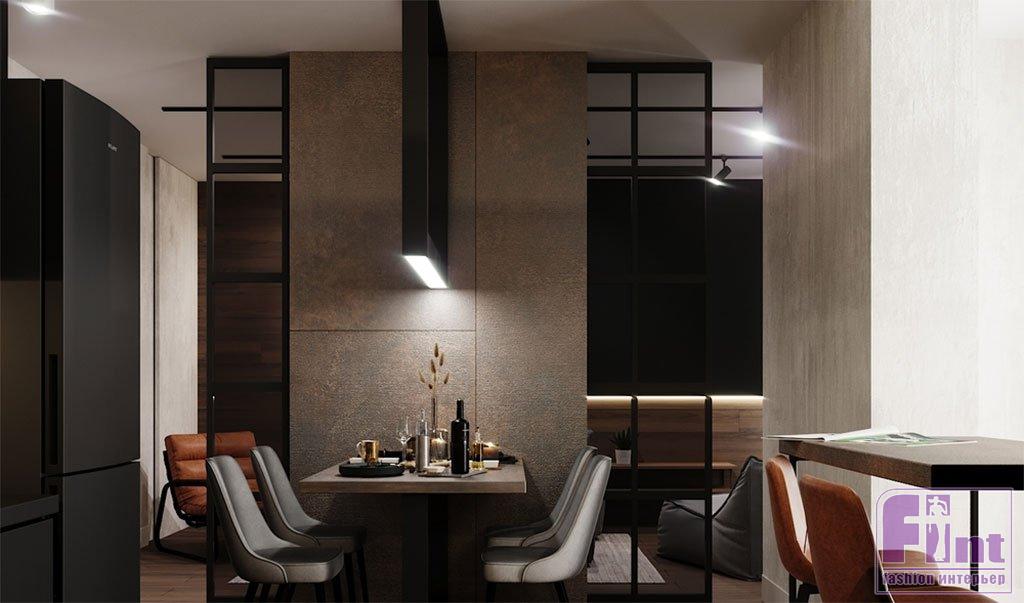 Общая цветовая гамма поддержана вставками ультраматовых чёрных поверхностей. Брутальные материалы — кухонная столешница из кварцита и мозаика в ванной «под камень» смягчены локальной подсветкой. Напольное покрытие — инженерная доска с фактурой дуба также делает интерьер уютнее, а плавный переход отделки пола на стены привносит в интерьер целостность.