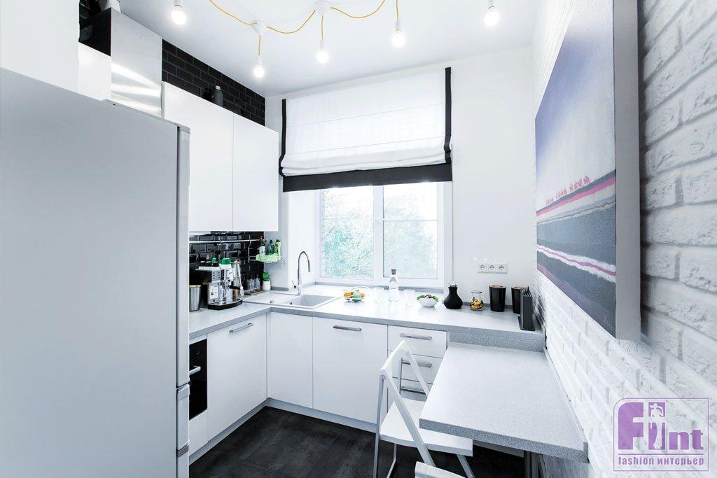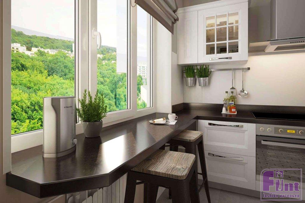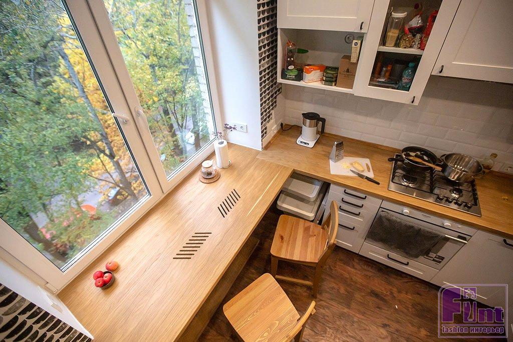 Ответ простой – задействуйте подоконник! Превратите подоконник в небольшой обеденный стол или барную стойку. Для этого нужно всего лишь немного расширить подоконник и продолжить его вдоль стены с окном. Вместо привычных пластиковых подоконников лучше использовать кухонную столешницу, которую нужно будет вырезать по форме и размерам окна и стены. При желании такой обеденный стол сможет вместить всю небольшую семью из трёх человек.
