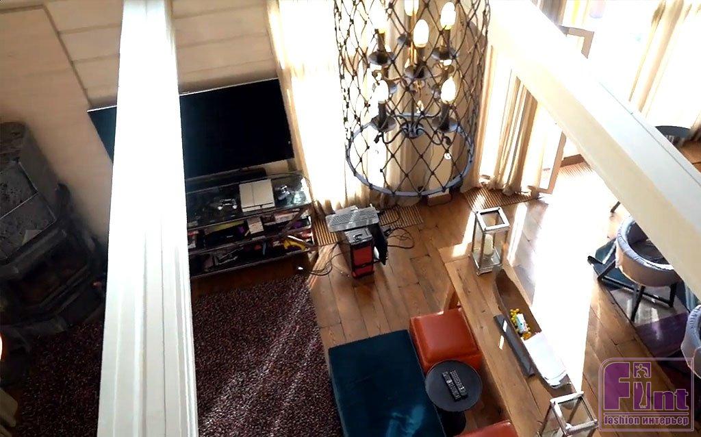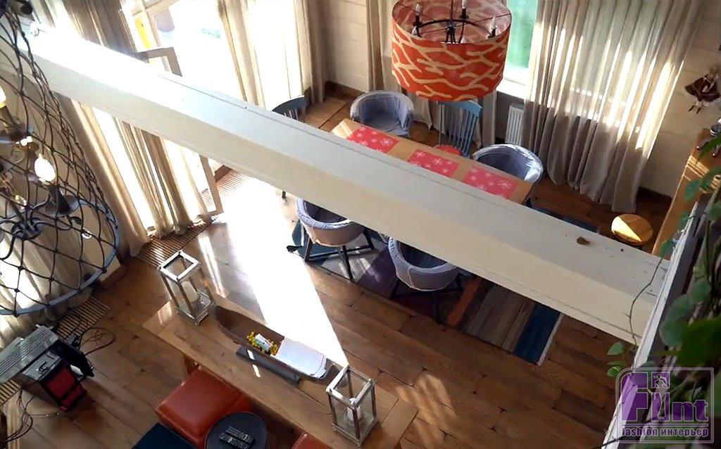 На первом этаже не стали возводить перегородки и объединили гостиную с кухней и обеденной зоной. Светло-бежевое оформление стен разбавили яркими акцентами кобальта и оранжевого цвета. Базовая краска имеет полупрозрачную фактуру, благодаря которой хорошо просматривается природный рисунок древесины. Изначально фигуристу не понравилась выбранная палитра, но дизайнер всё же настояла на таком решении и оказалась права. Гостиная выглядит очень просторной, и ни один элемент не утяжеляет интерьер.