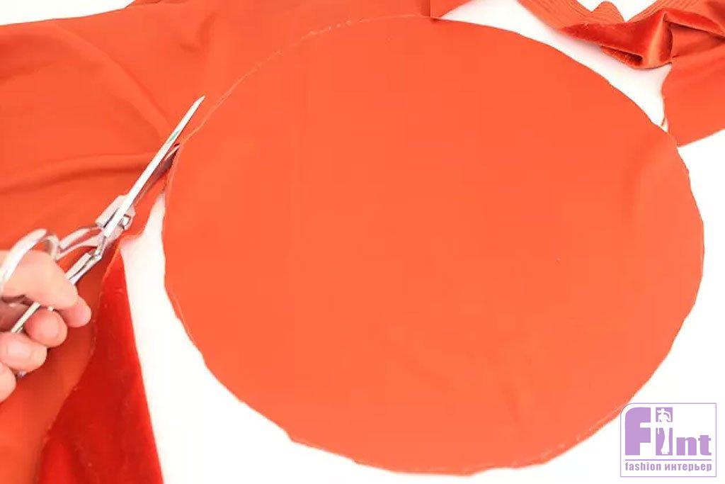 Вырежьте намеченный круг из ткани по контуру при помощи ножниц. Этот 33-сантиметровый круг поможет нам сделать тыкву диаметром примерно 13 см. 40-сантиметровый круг образует 15-сантиметровую тыкву, а 45-сантиметровый круг позволяет сделать большую тыкву диаметром около 18 – 20 см.