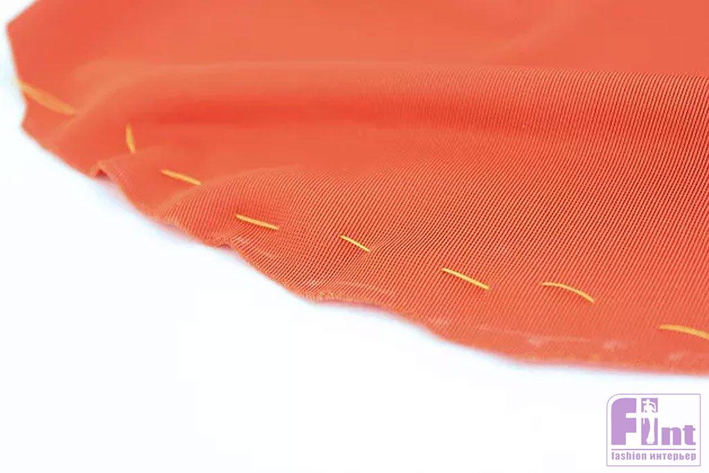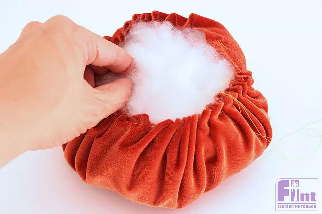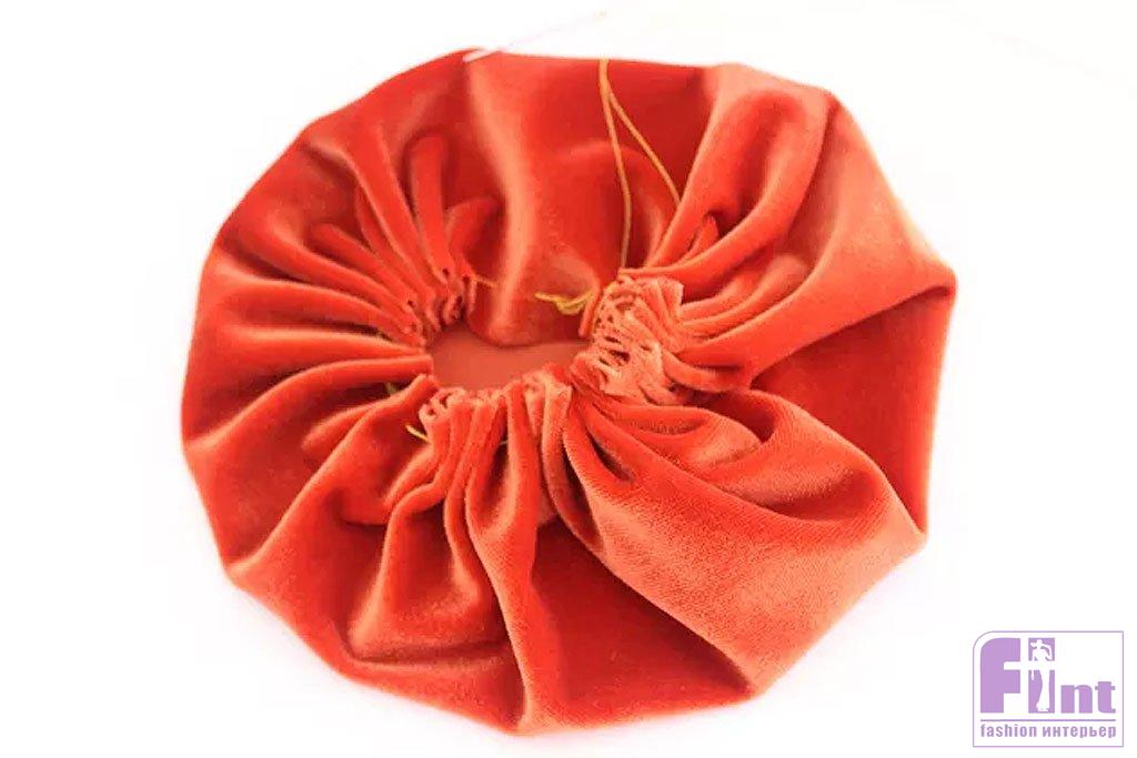С изнанки бархатной ткани прошейте намёточную строчку, располагая стежки примерно на расстоянии 5 – 6 миллиметров от края заготовки. Старайтесь, чтобы стежки были длиной около 1 – 1,2 см. После того, как вы прошили весь круг, потяните за нить, чтобы собрать ткань в мешочек. Излишки нитки пока не отрезайте!